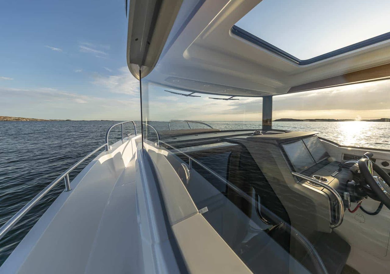 Det som framgår direkt av bilderna är att Nimbus C9 erbjuder en exceptionellt luftig hytt med stora fönster och smala rutramar samt en stor taklucka i glas. Sidodörrarna är stora och det lär gå smidigt för passagerarna i aktern att kliva i och ur. I fören finns toalett och kojplatser – till synes precis som på systermodellerna W9 och T9.
