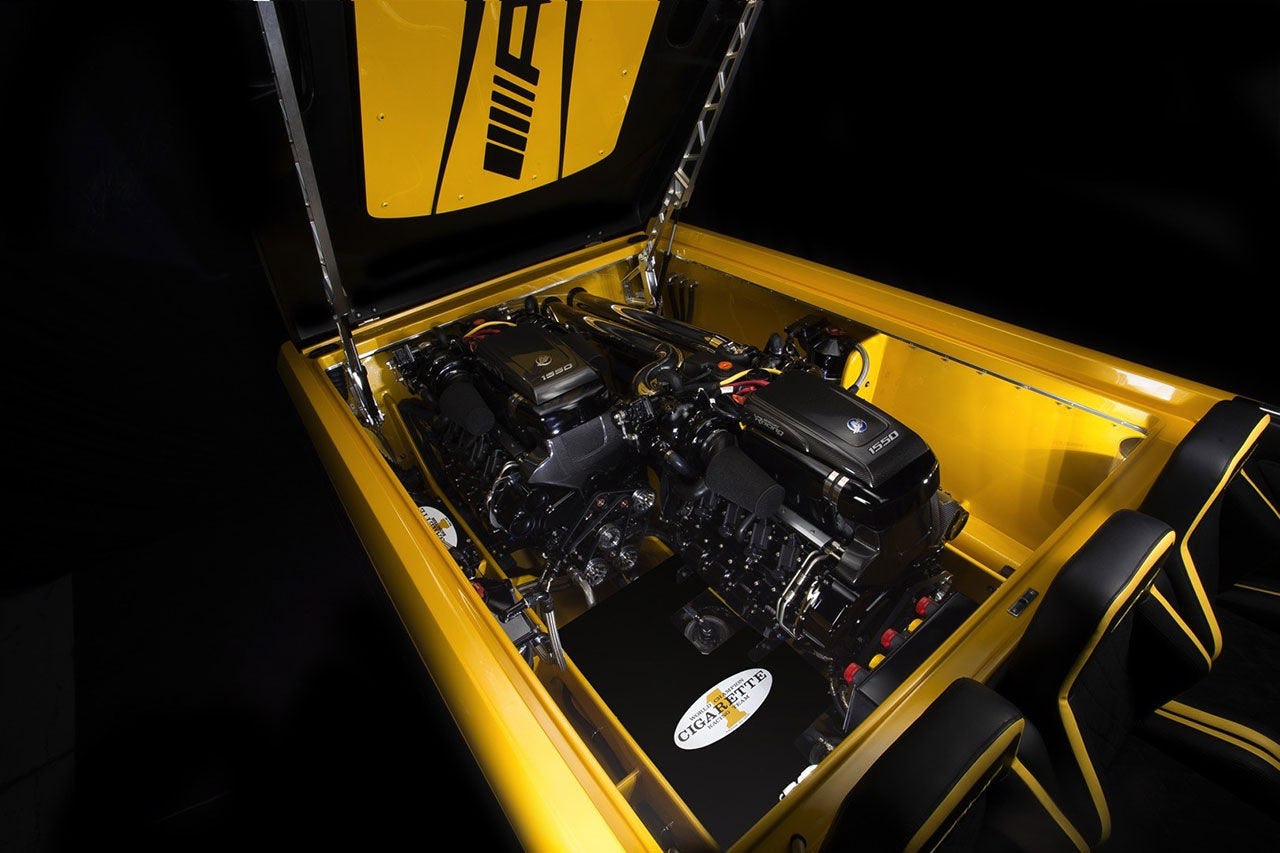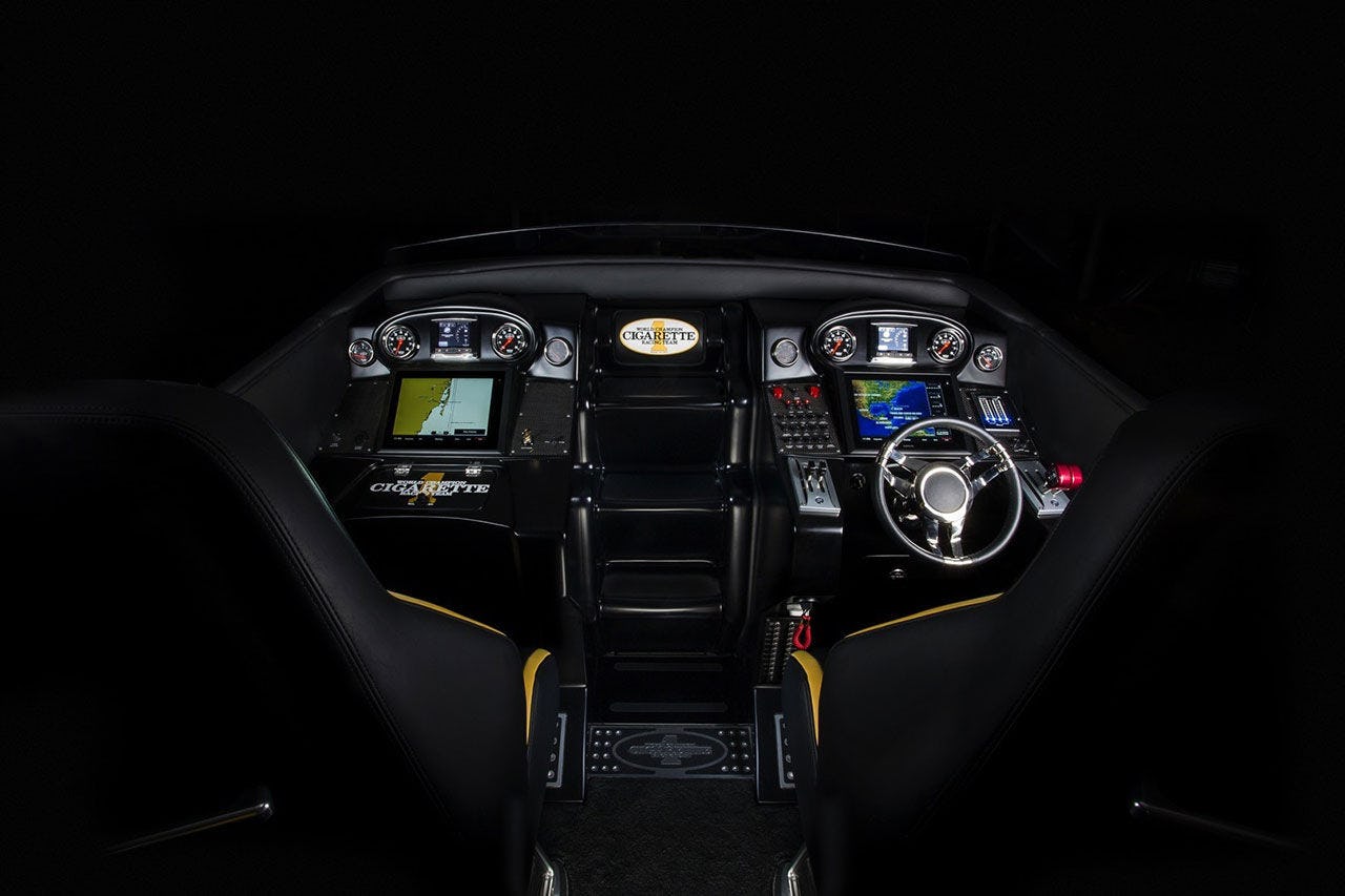 Även om inredningen fortarande andas klassisk Cigarette är den rustad med det senaste av teknologi såsom blåtandskommunikation, fyra stora navigationsskärmar med extra allt från Garmin, samt ett ljudsystem som lär kunna skrämma slag även på luttrade motorbluddergubbar.