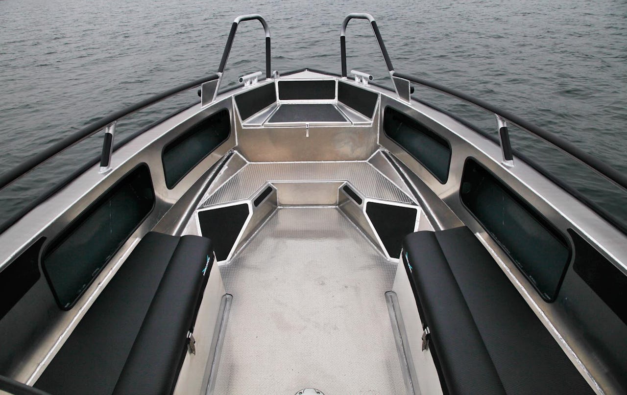 Om ni kikar noga ser ni att det finns många vinklade ytor, vilket är dyrt att göra och därför ovanligt på alubåtar. Det förbättrar ergonimin och ger en tuffare look. Men det är under instrumentpanelen som den ballaste detaljen sitter…