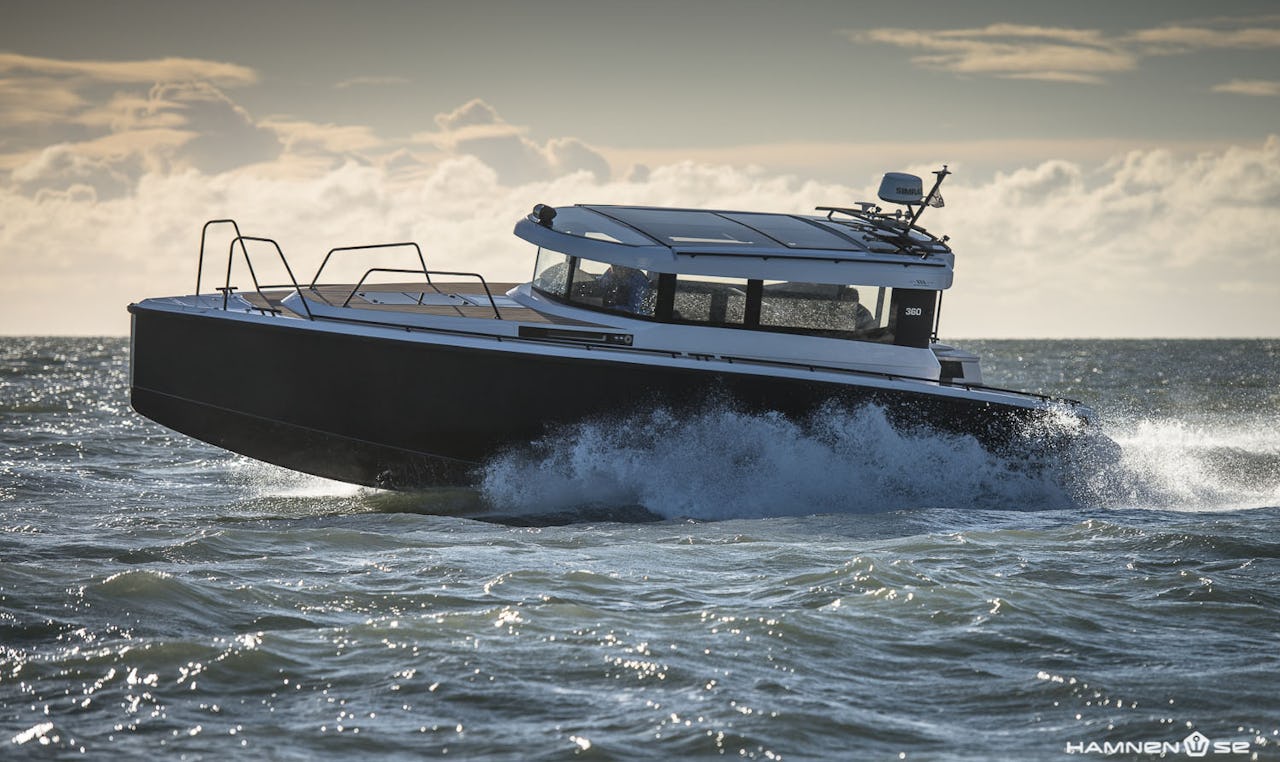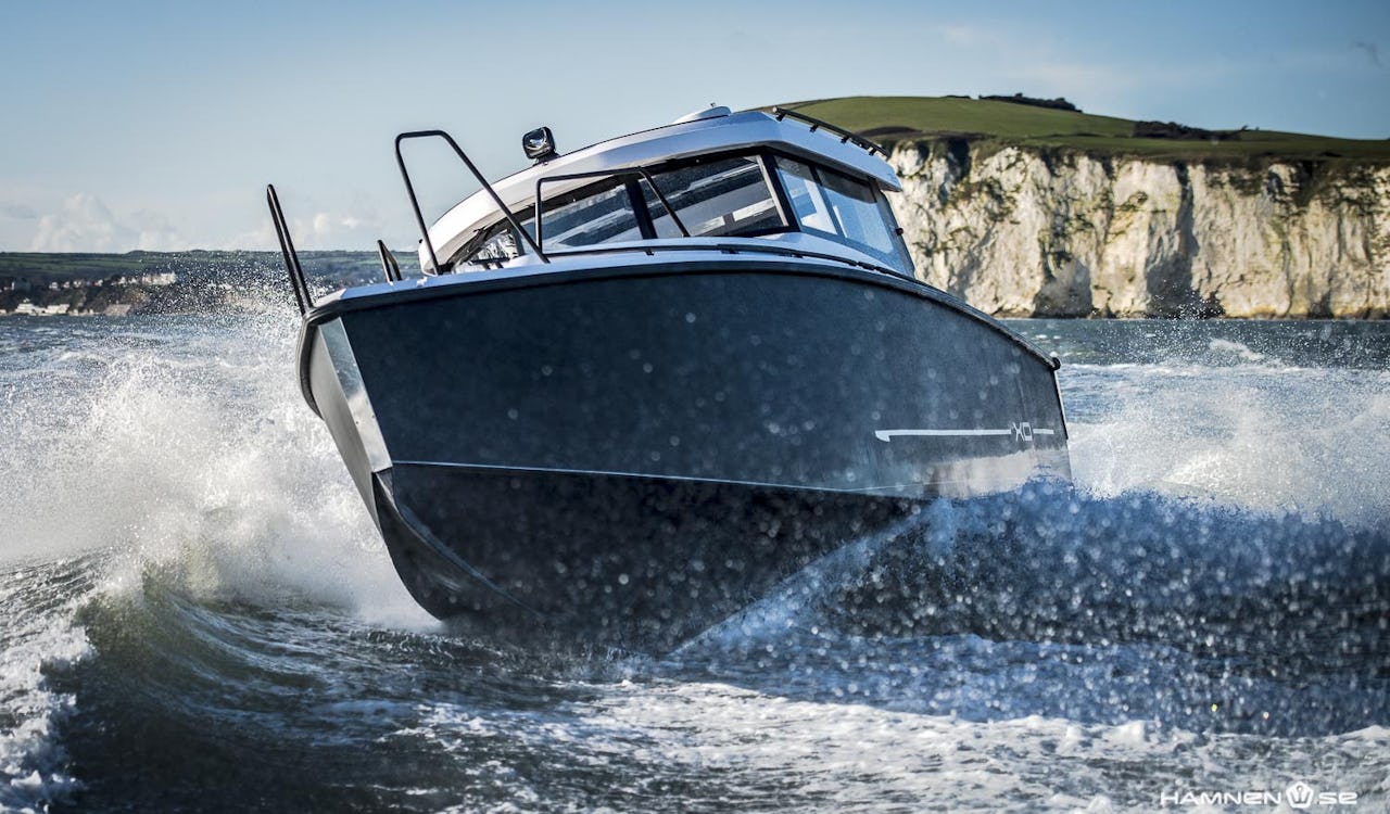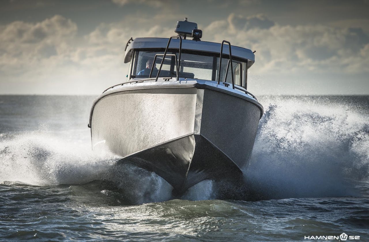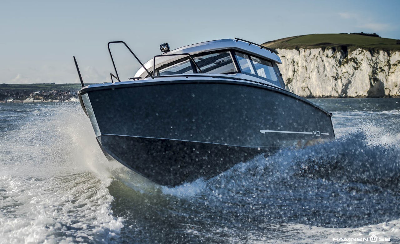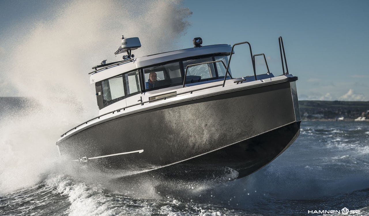 Med denna best ska det finska aluminiummärket följa upp sin nya snygga designlinje som först sågs i XO 250 (se videon när vi testar XO 250) som hade premiär ifjol. Men istället för att konkurrera med Buster, Anytec, Viggo och alla andra tuffa öppna alubåtar så siktar de nu in sig på Targa, Delta, Sargo och andra svindyra allvädersbåtar i lyxklassen.