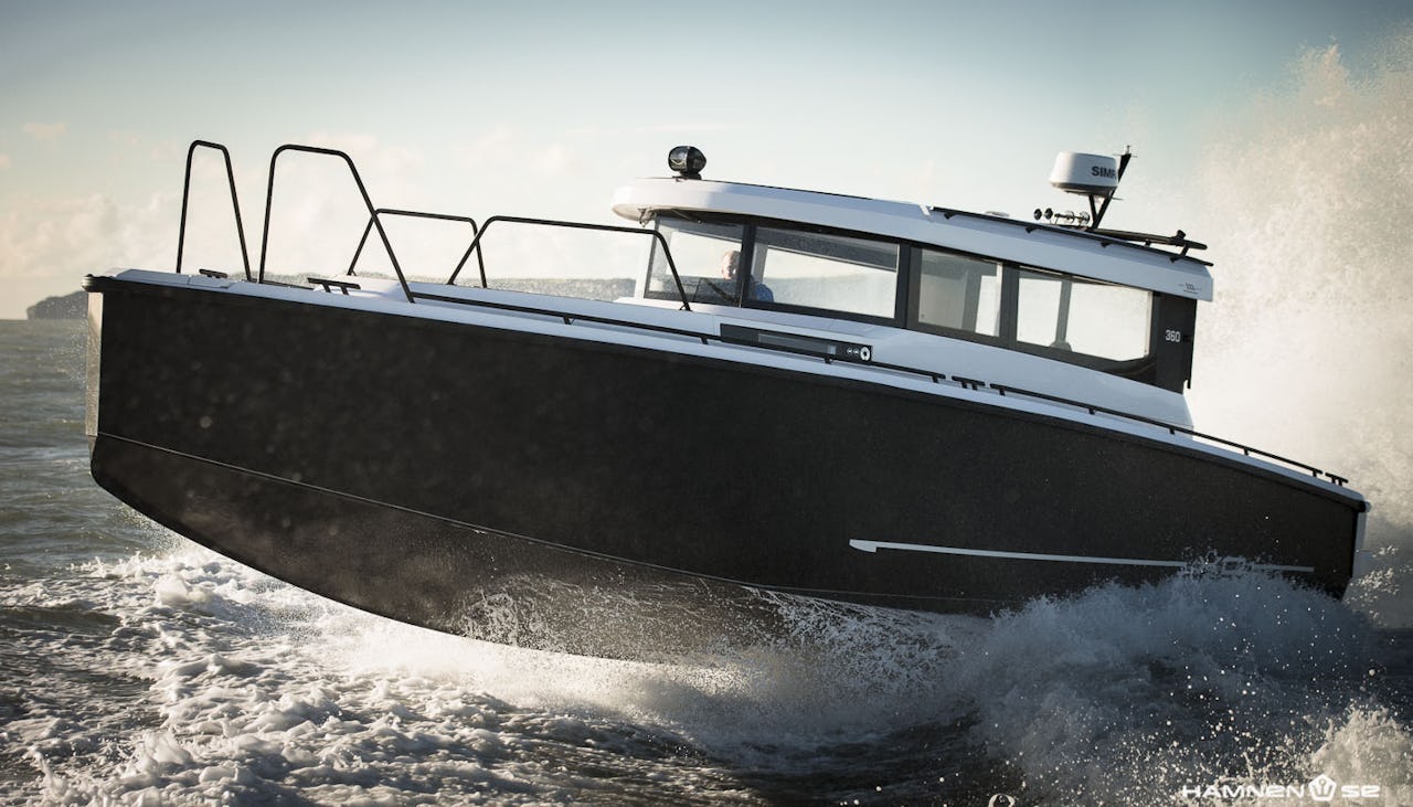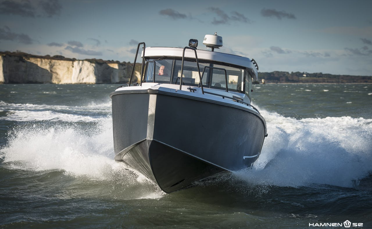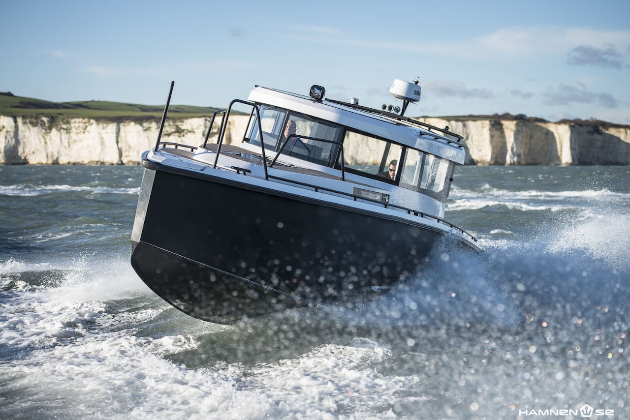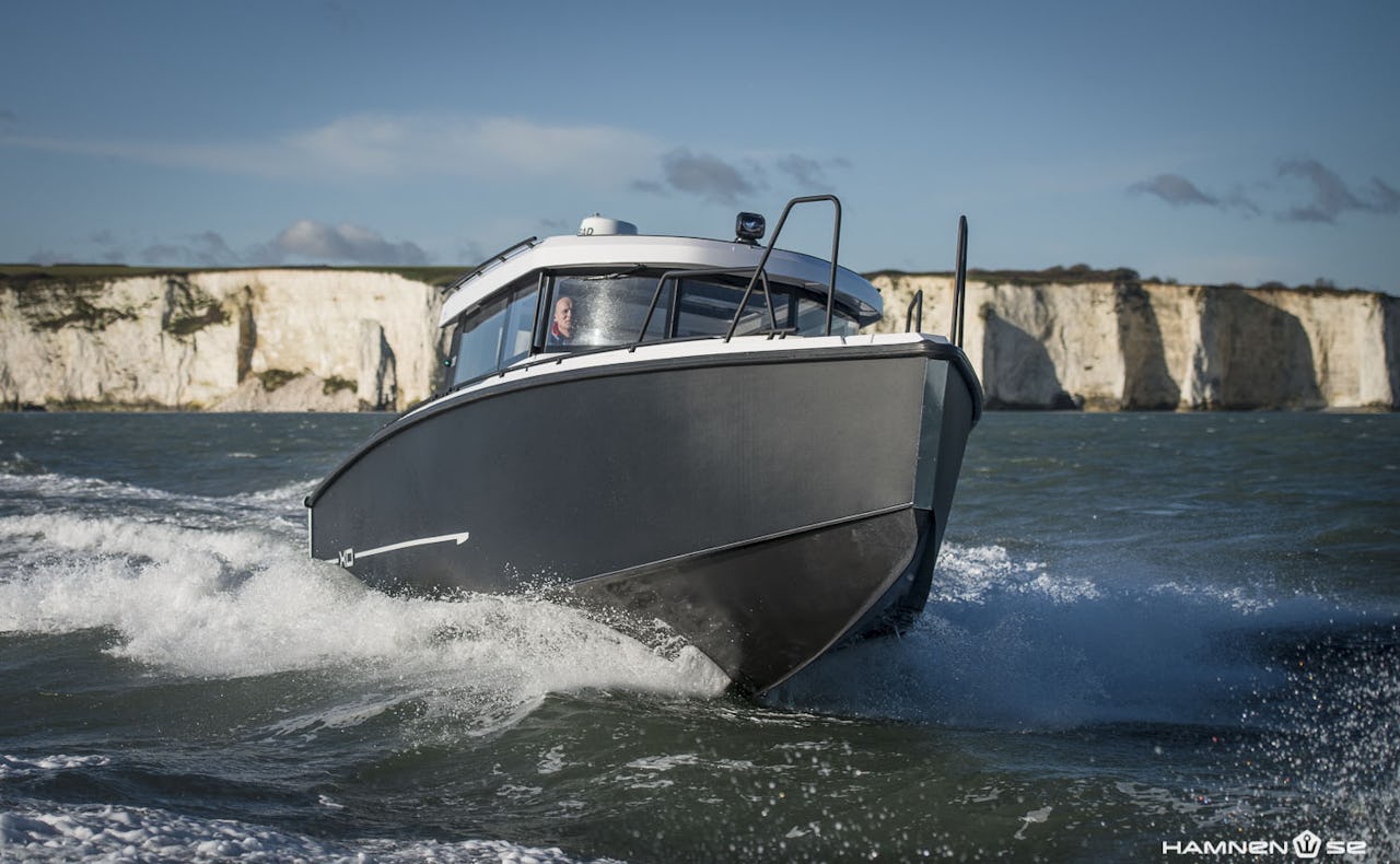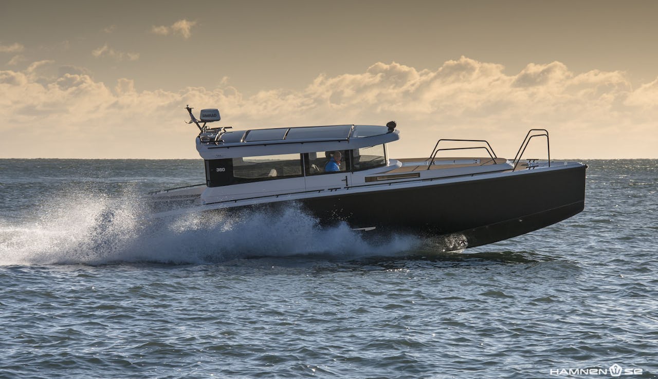 Med denna best ska det finska aluminiummärket följa upp sin nya snygga designlinje som först sågs i XO 250 (se videon när vi testar XO 250) som hade premiär ifjol. Men istället för att konkurrera med Buster, Anytec, Viggo och alla andra tuffa öppna alubåtar så siktar de nu in sig på Targa, Delta, Sargo och andra svindyra allvädersbåtar i lyxklassen.