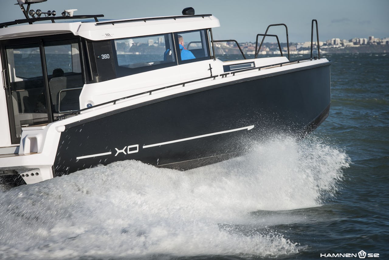 Det är inget litet kliv som XO tar med sin nya 360. Nio fot långt, för att vara petig. Men vi kan efter en intensiv testdag i kulingvindar och riktigt elaka vågor utanför engelska Poole, där det första exemplaret befinner sig, berätta att XO inte helt och hållet tagit sig vatten över huvudet. Kanske till och med tvärtom.