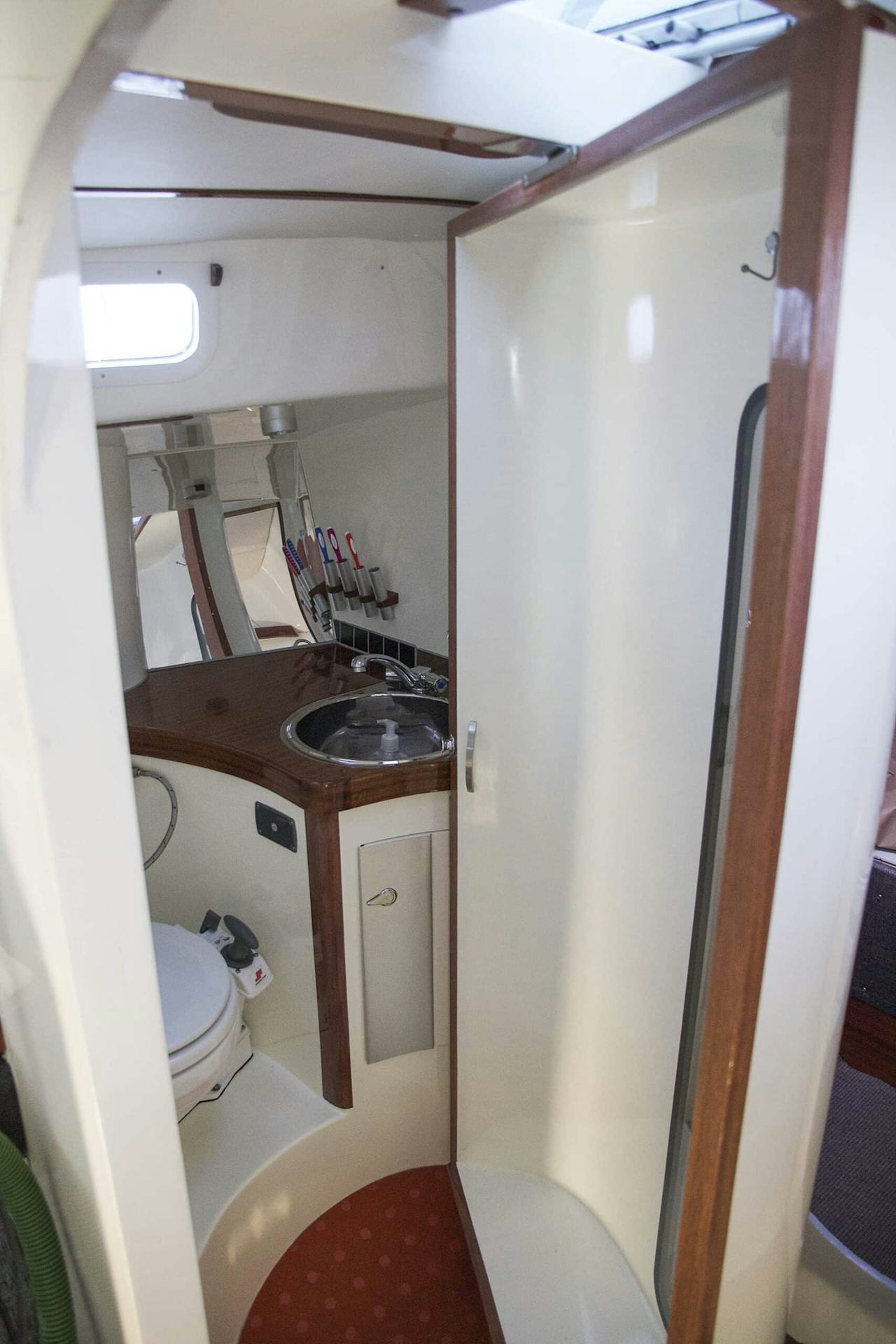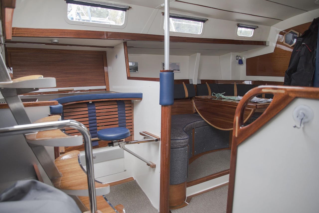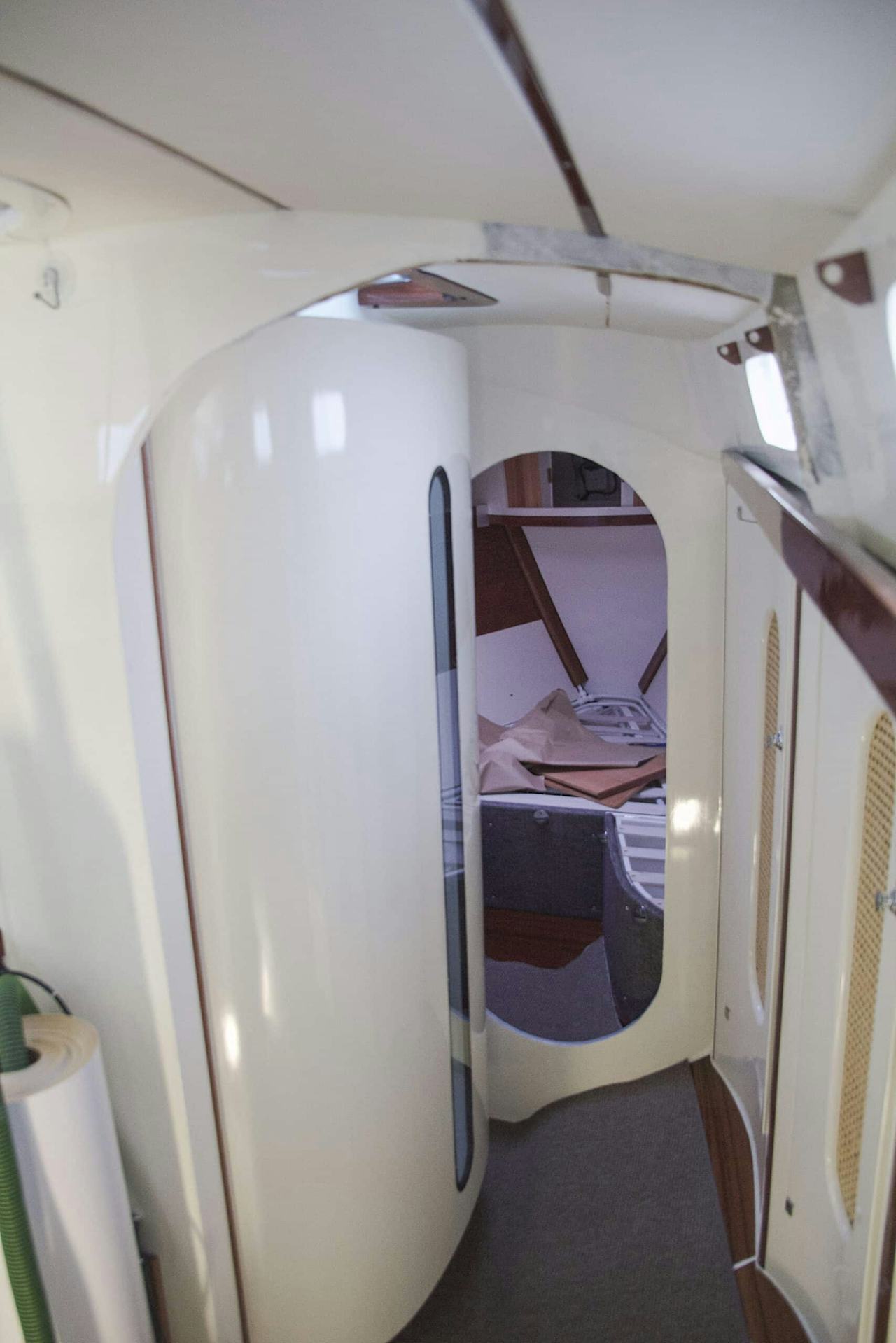 – Nästa grej, säger Beppe, är att vi har dragit nytta av att den gamla långfärdseglaren OE 32 är så gediget byggd som den är. Det har gjort att vi utan risk har kunnat ta bort halva huvudskottet och på så sätt öppnat upp ytan mellan salong och förpik så att det har blivit en sammanhängande enhet.