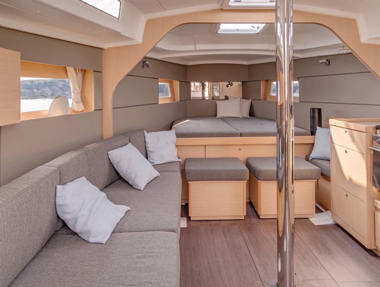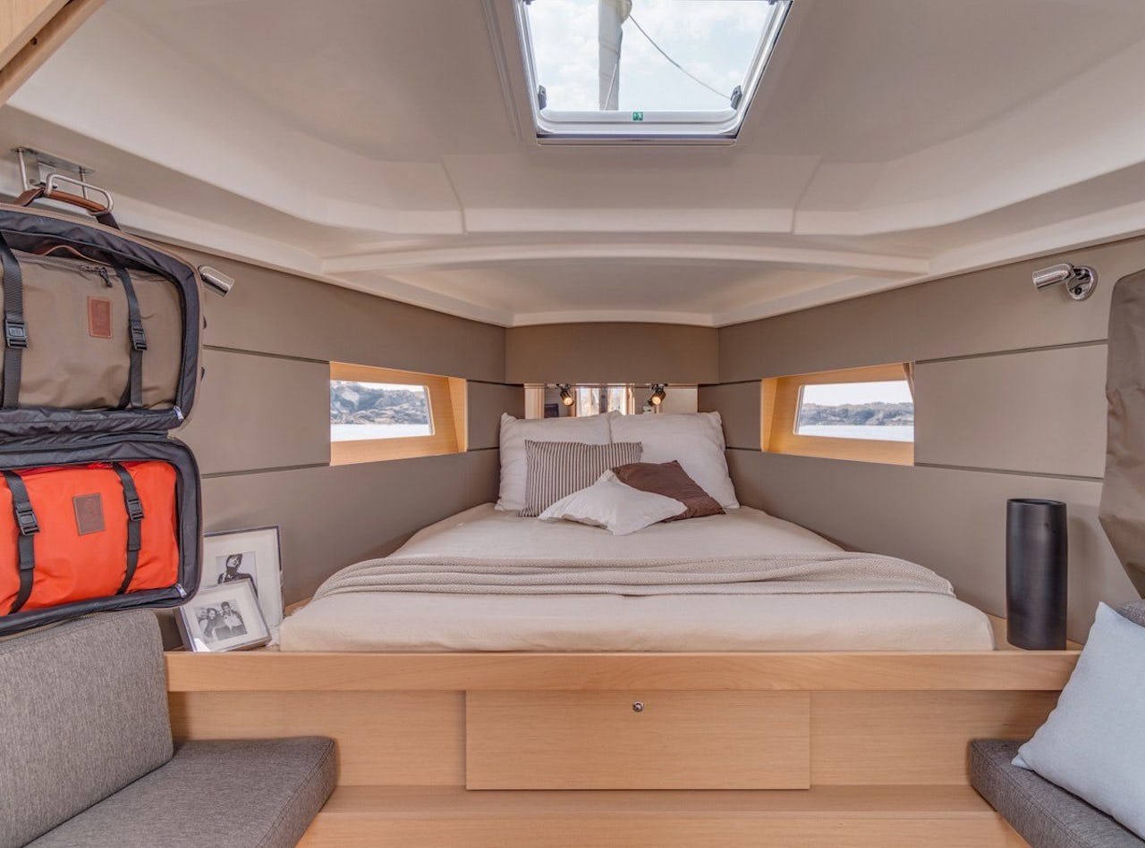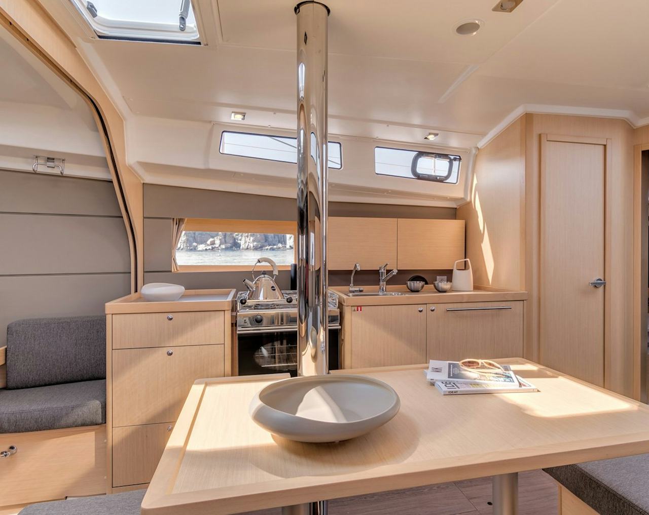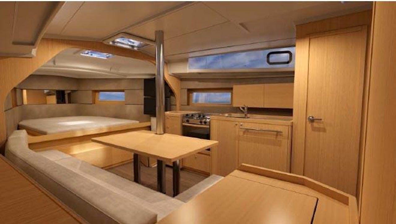 Inget huvudskott. Öppen planlösning och gott om svängrum. Det tillsammans med rappa seglingsegenskaper är vad Beneteau tror är framtiden.