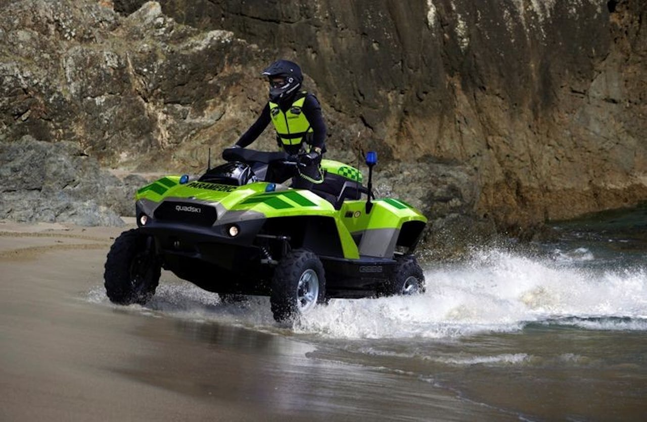 Quadski klarar 72 km/h på land och på bara sekunder förvandlas den till vattenskoter och accelererar snabbt till 40 knop. Detta gör den till världens snabbaste amfibiefordon. Det är den största fyrhjulingen/vattenskotern på marknaden och skaparen är en extremt envis uppfinnare från Nya Zeeland.