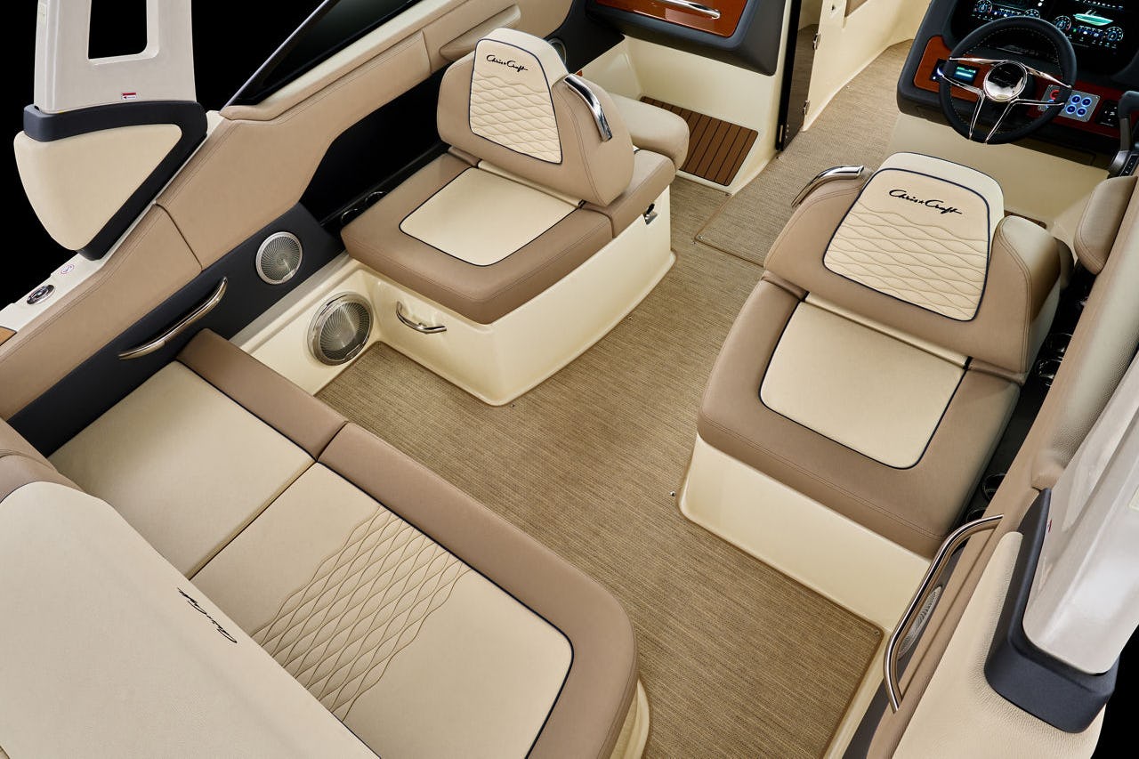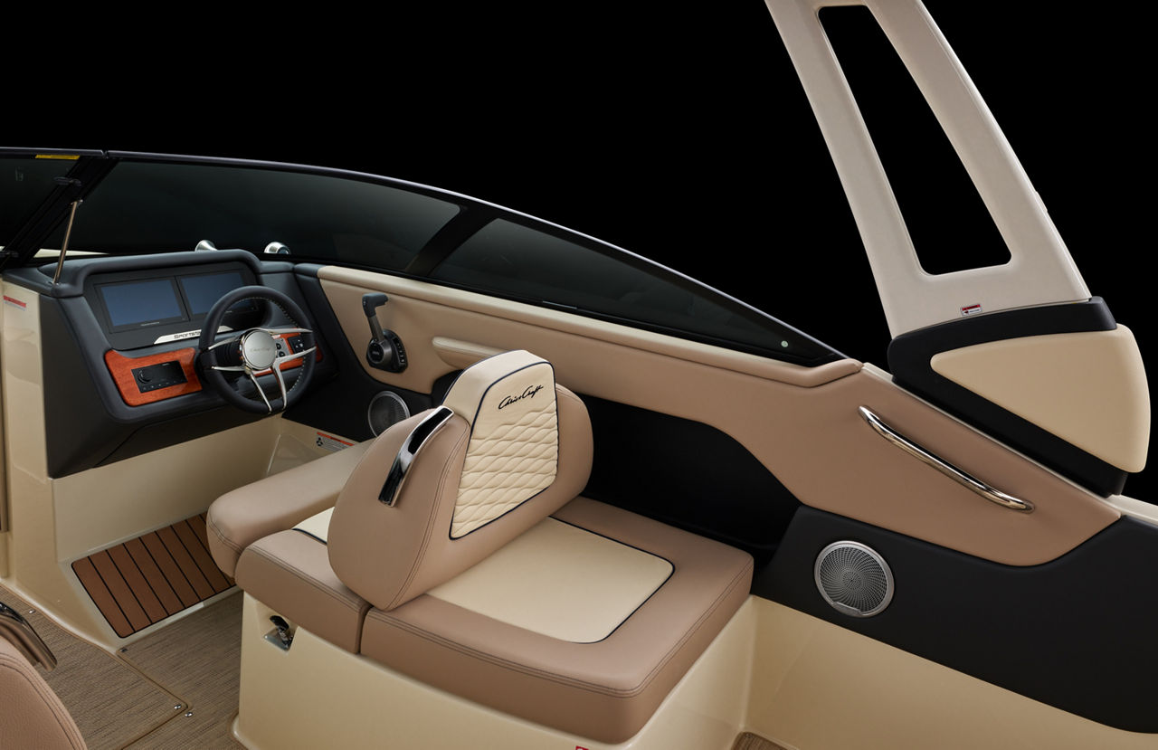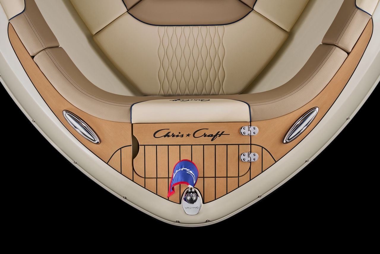 Chris Craft visar också prov på stor uppfinningsrikedom när det gäller hur sittbrunnarna (såväl framför som bakom vindrutan) är utformade. Även här kan man arrangera såsom det passar för stunden, göra om separata säten till en U-soffa, trolla fram ett cafébord eller förvandla såväl förar- som passagerarstolen till en smidig solbädd.