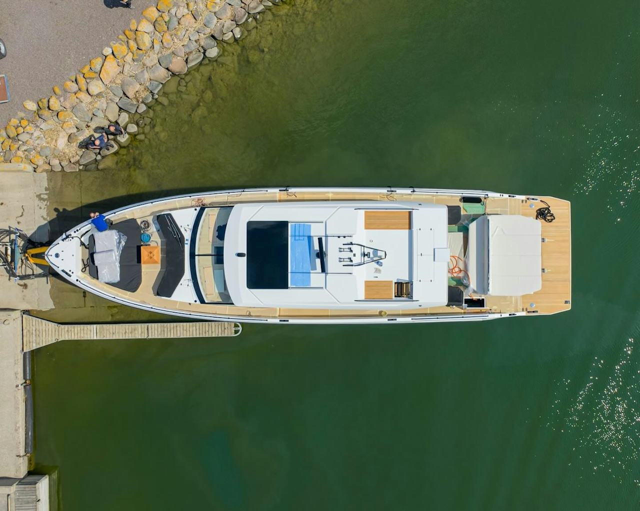 Båten är designad för att vara en social plattform till sjöss, med sittplatser för upp till 20 gäster. På sagda tema finns sålunda flera loungeområden, inklusive en öppen akter med L-formade soffor, en central solbädd och en hydraulisk badplattform. Och så förstås – helt enligt trenden när det gäller båtar i tungviktsklassen – en soffa och en separat solbädd på fördäcket. Om det ändå inte skulle räcka finns ytterligare en solbädd spå taket.
