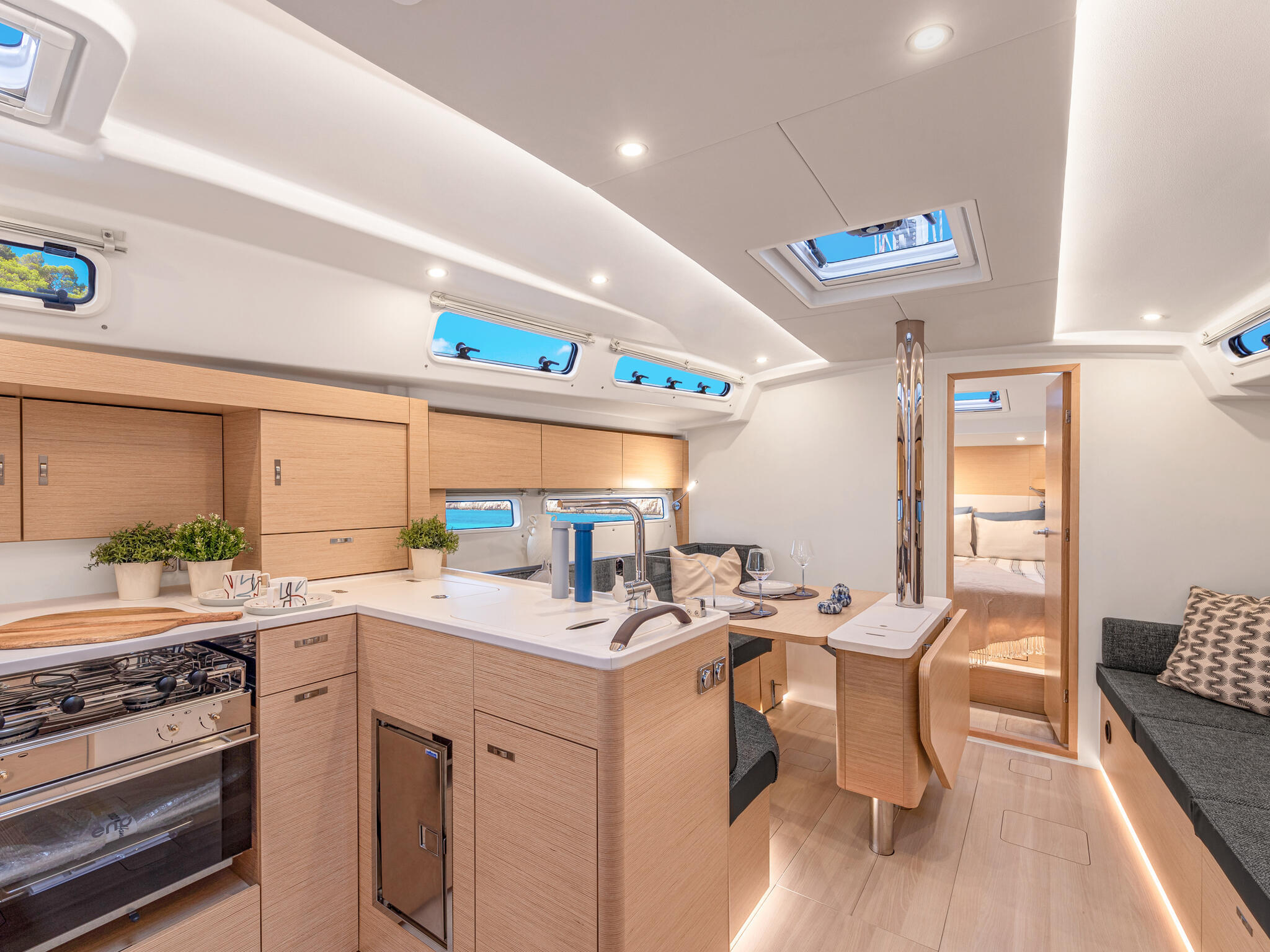 Storskotslösningen saknar en dedikerad skotskena, rattpedistalerna med skärmar och knappar för elektroniska furlingsystem lyser med sin frånvaro och de högglansiga träytorna som några av branschkollegorna stoltserar med har ersatts med gelcoat. Tanken är tydlig: funktion ska finnas, men finess och kostsamma detaljer skalas bort.