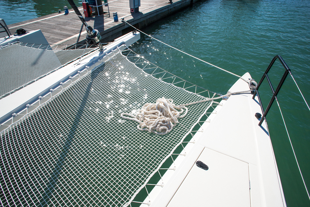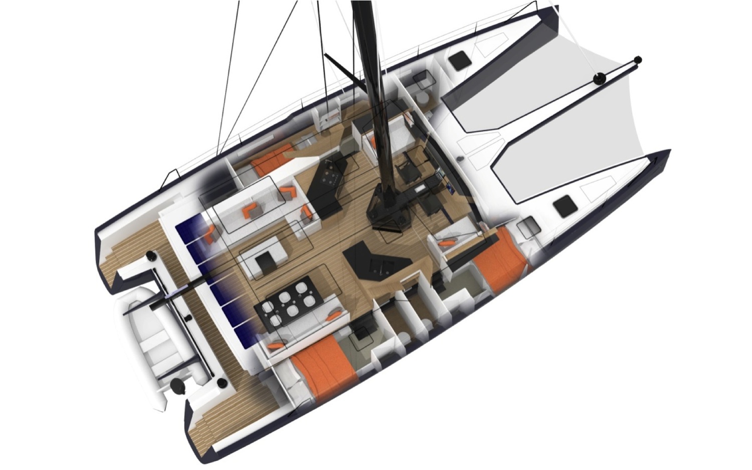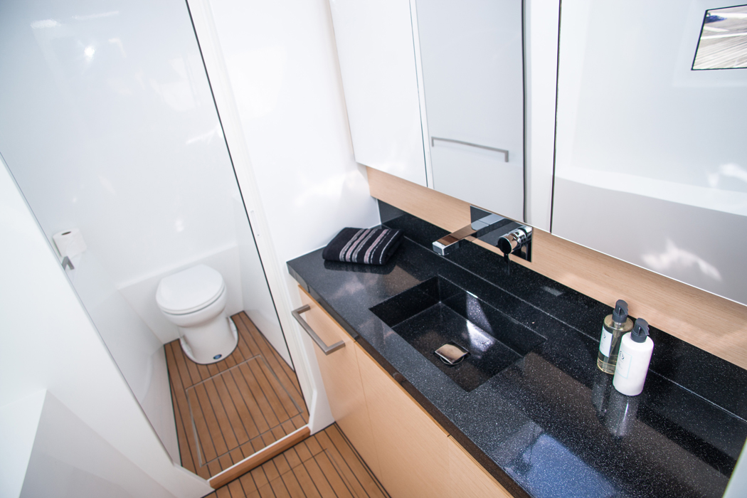 Babordsskrovet är själva ägarkabinen med sovplats, toalettutrymme och dusch. I styrbordsskrovet finns två gästkabiner med en dubbelbädd i varje samt ytterligare två toalettutrymmen.