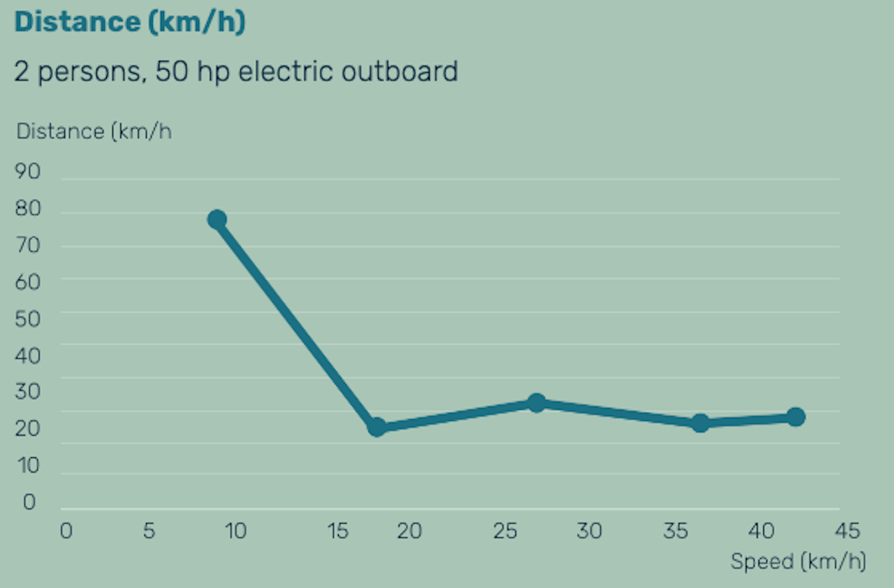 På sin hemsida har Stream publicerat två diagram. Det ena visar hur länge batterierna räcker vid olika hastigheter och det andra hur långt båten tar sig kopplat till båtfart.