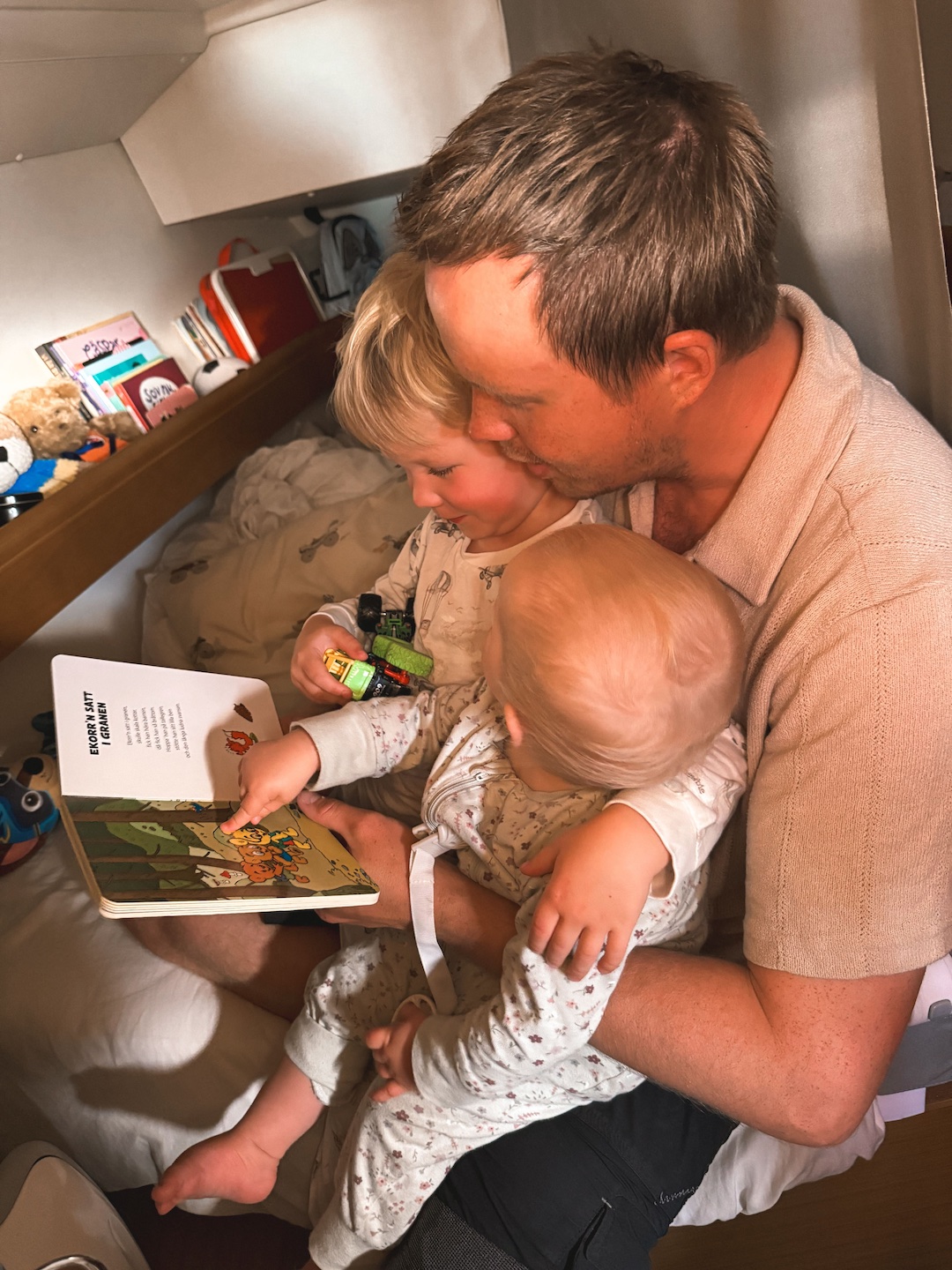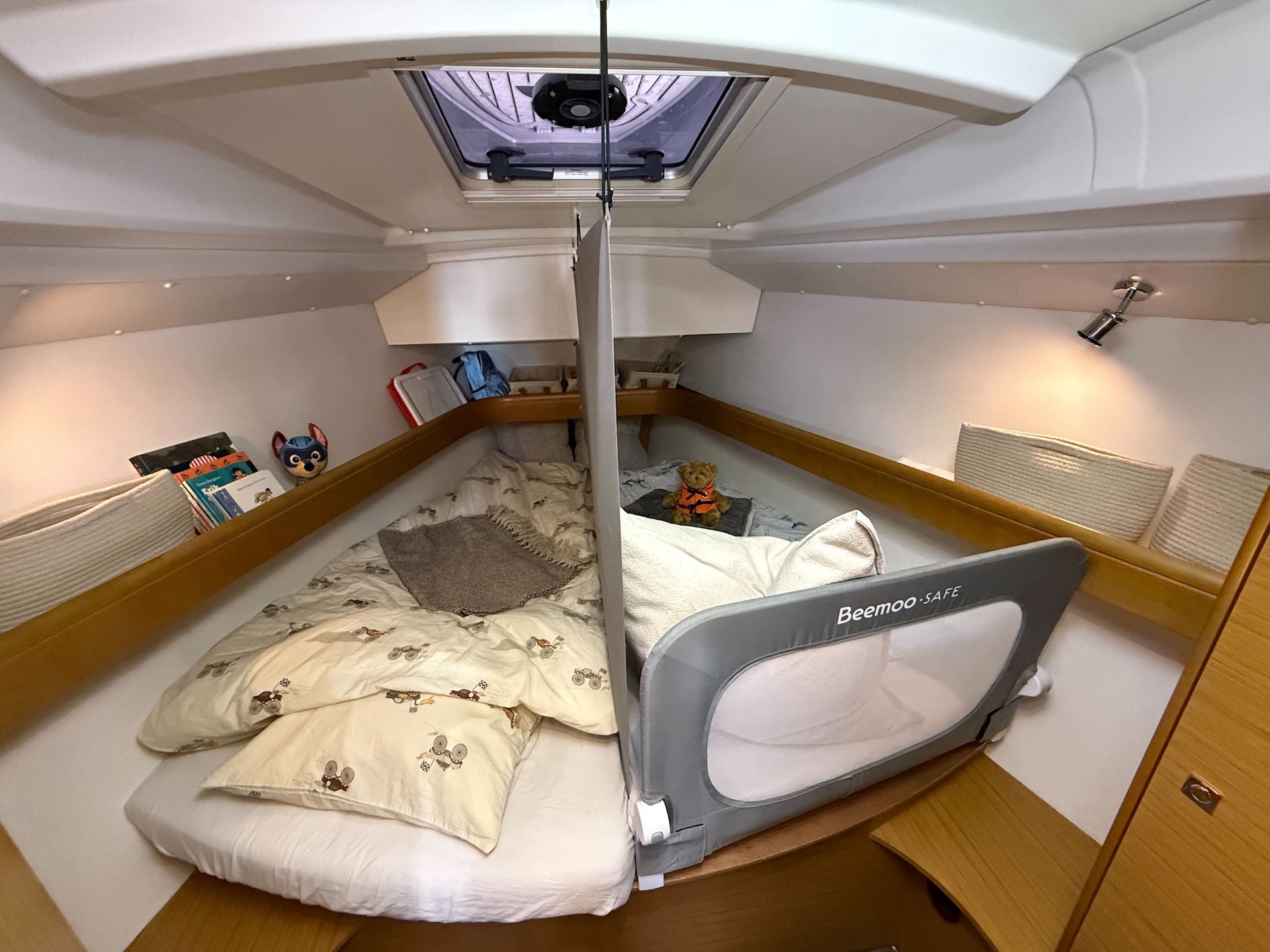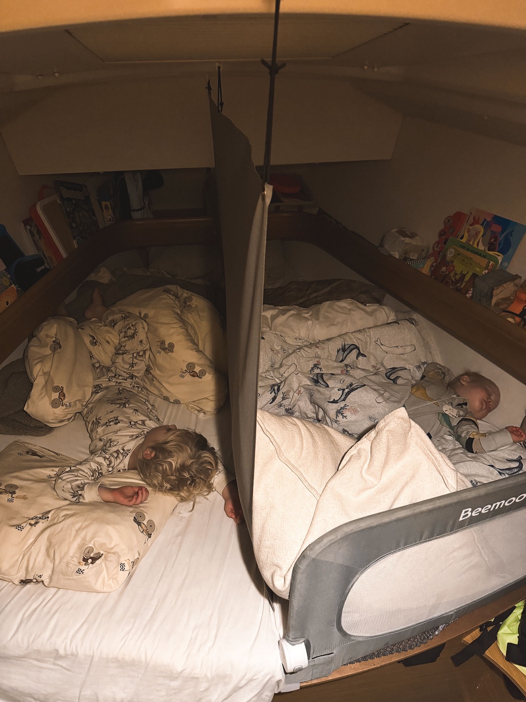 – Nästa grej är att vi har tillverkat en avskiljare i förpiken. En enkel och flexibel lösning, anpassad efter hur vi faktiskt använder båten. Barnen har nu varsina egna små krypin som de kallar dem för ”mitt rum”.
