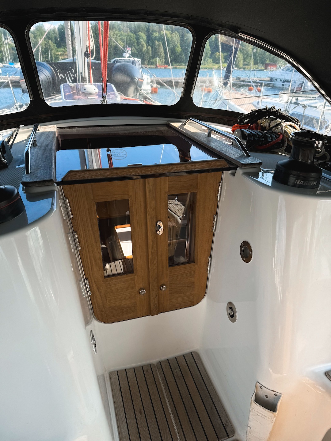 – Ja. Semestersegling är en sak. Heltidsboende en helt annan. Jag hanterar till exempel gärna en bångstyrig nedgångslucka under en helg eller en semester men efter jobbet och hämtning av trötta barn på förskolan så måste det vara smidigt. Nu har vi en vackrare och framför allt jättesmidig och hemmasnickrad lucka med dörrar i teak samt massor av ljusinsläpp.