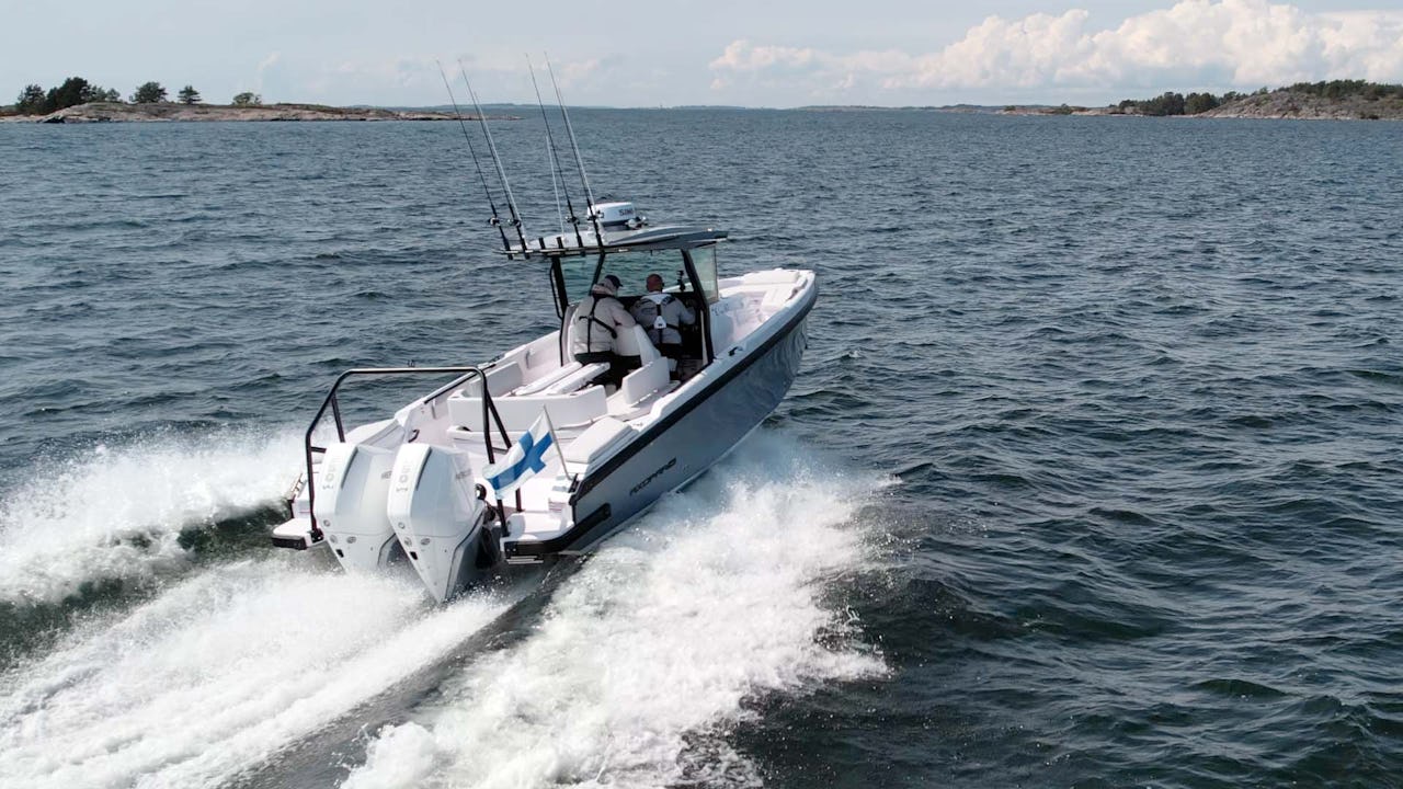 Med dubbla 250-hästars Mercury V8:or på akterspegeln är det full fart från första gaspådraget. Planingströskeln är näst intill obefintlig och båten skjuter iväg som en raket. Topphastigheten landar på dryga 52 knop, och Olivecrona beskriver känslan som både rå och trygg.