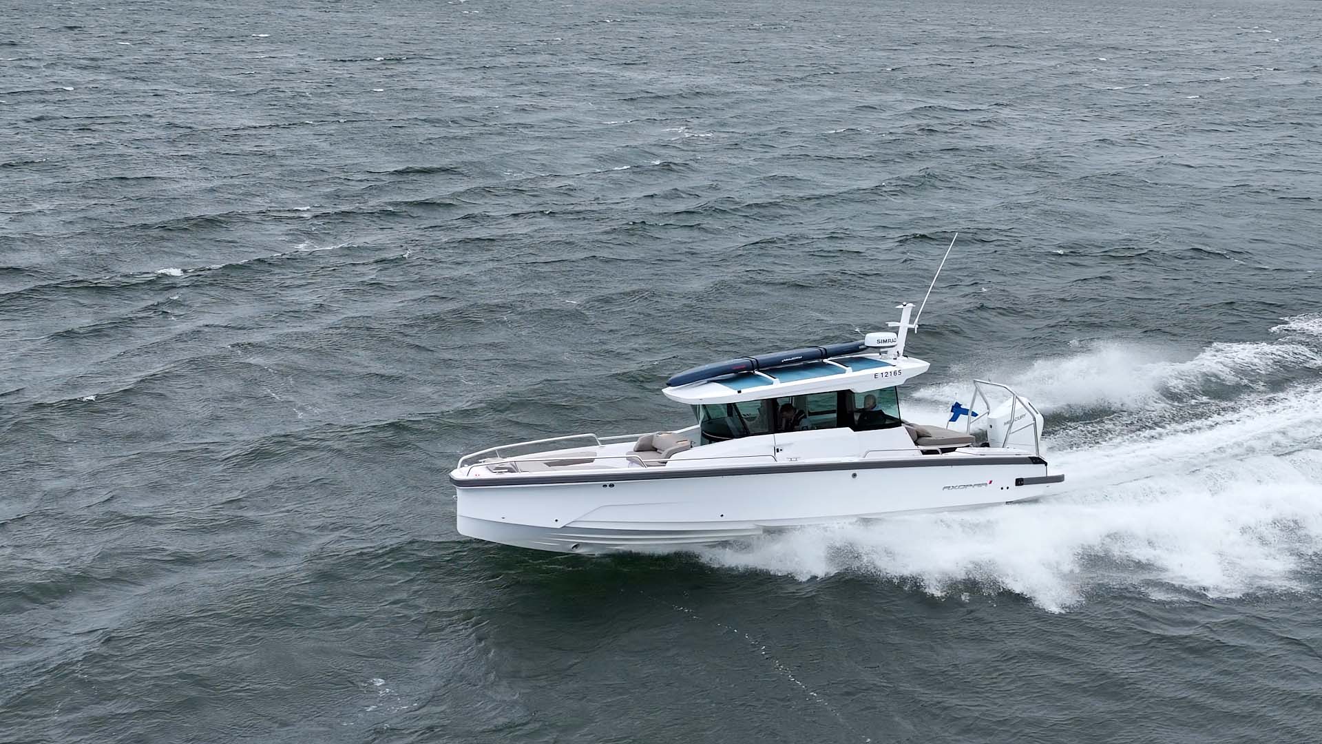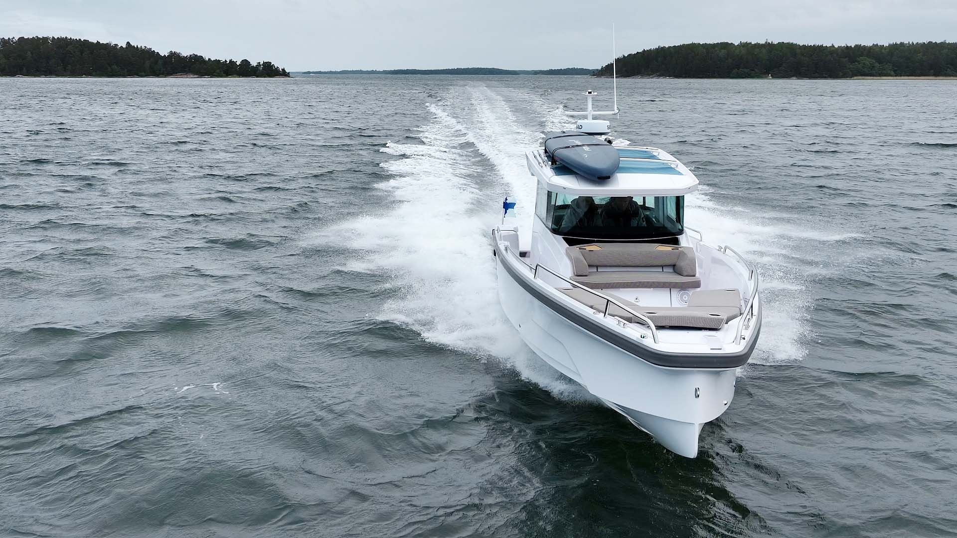 Med en Mercury V10 på 400 hästkrafter kliver båten snabbt upp i planing. Marschfarten hamnar runt 35 knop, toppfarten i testet landade på 43 knop trots stökig sjö. Bränsleförbrukningen får godkänt med plus i kanten – mellan 1,7 och 2 liter per sjömil i 25–35 knop. Det nya stabiliserinssystemet från amerikanska Seakeeper avdramatiserar tillvaron ombord märkbart mycket. En finess som annars framförallt syns på betydligt mycket större båtar.