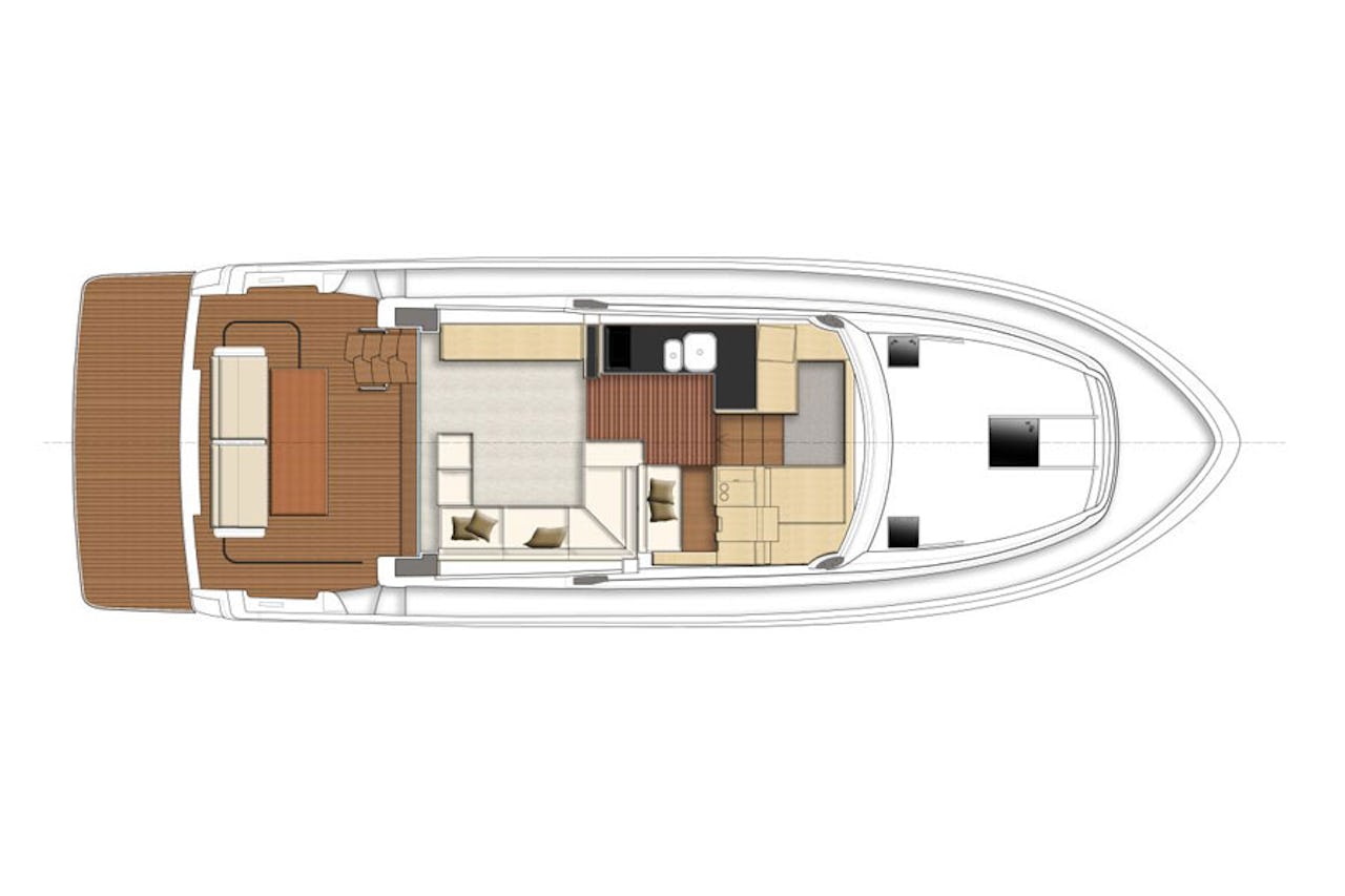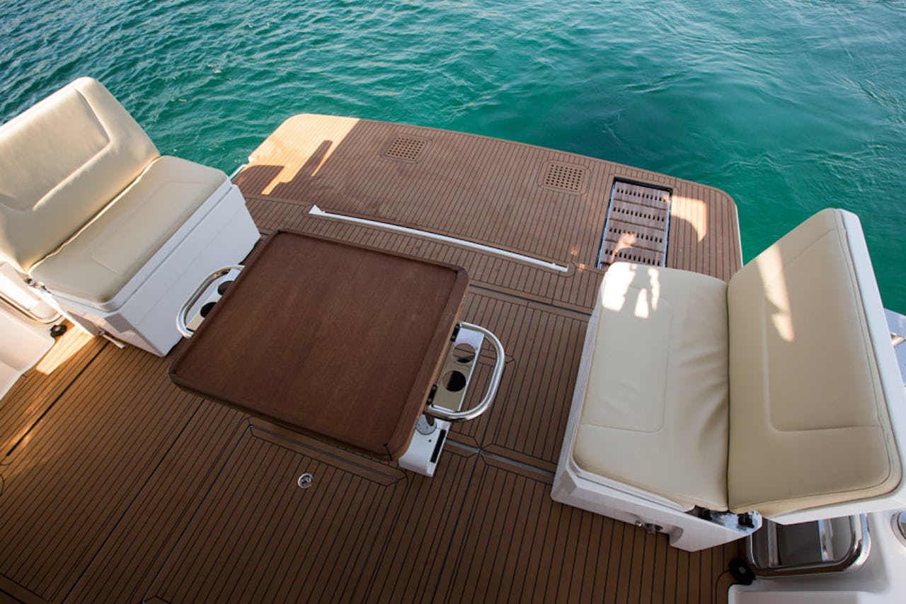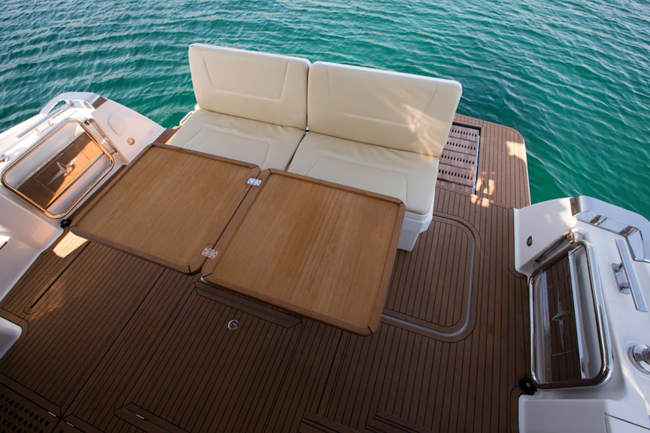 Bordet och soffan på akterdäcket är en historia för sig. De går på räls och kan arrangeras på alla möjliga sätt. Sitgrupp ellert fri mingelyta? Du väljer.