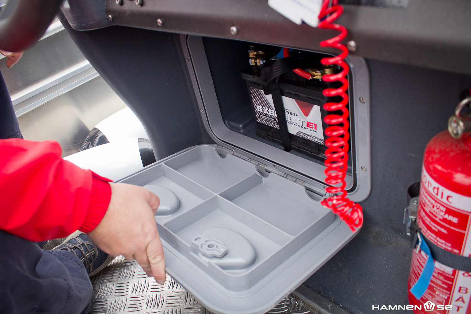Styrpulpeten ger dugligt skydd och har ett bra fack för plånbok, telefon och annat som behöver förvaras torrt men lättillgängligt. Plats finns för en 7-tumsplotter. Gott så. Men när det gäller förarplatsens utformning i övrigt finns det mer att önska när det gäller körkomforten. För på Faster 495 med tilläggsbetäckningen ”i” består sittplasten bakom rutan bara av en enkel toft/stuvfack. Detta ger fördelen att dyrkytan framför förarplatsen blir föredömligt stor. Nackdelen är att körställningen blir ganska krystad (vilket syns på inledningsbilden till den här artikeln).