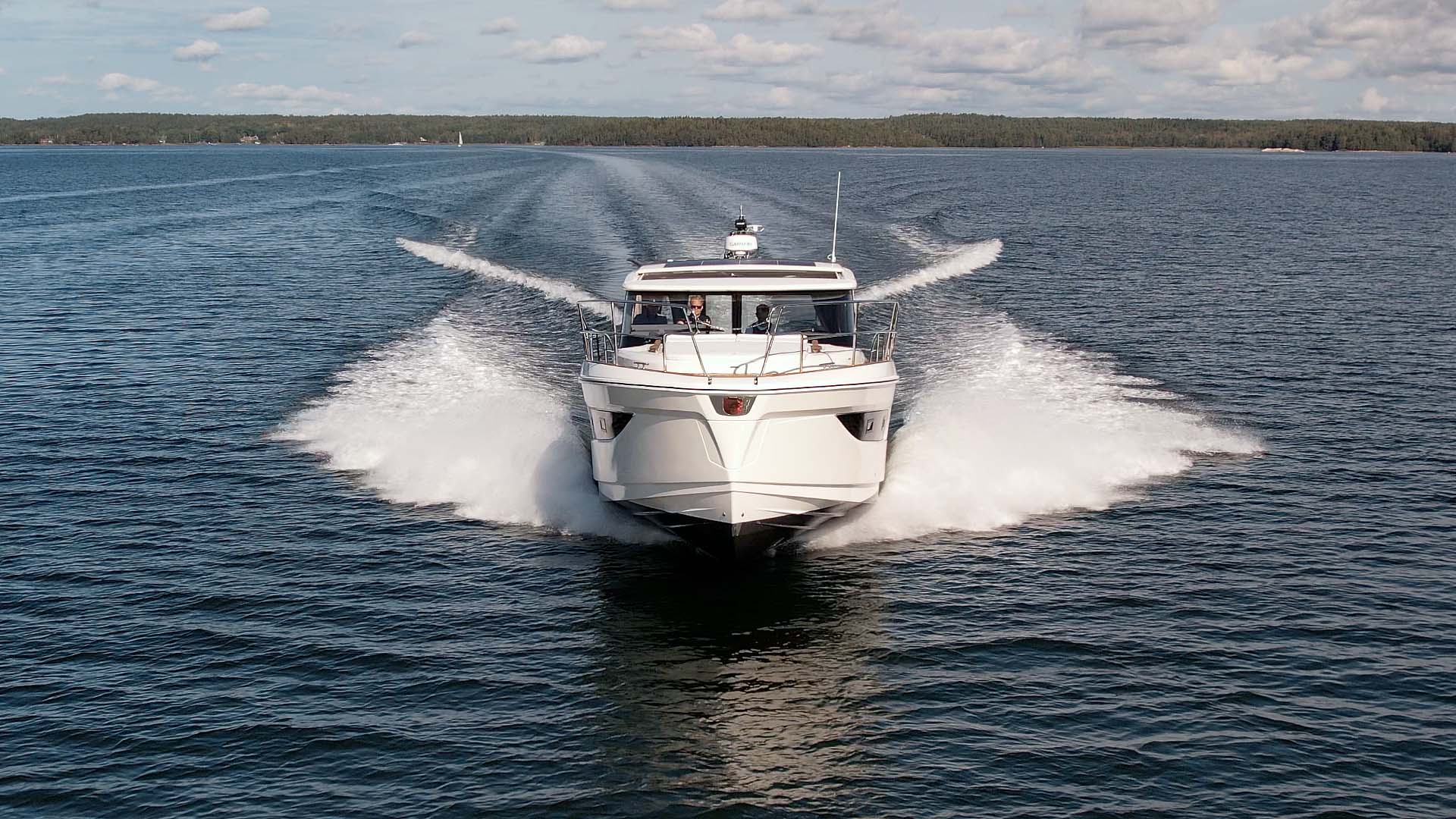 Allt detta har Skippos utsände reporter med sig, bokstavligt talat, när han kastar loss för en test. En test där båten visar på en mäktig inbyggd pondus när det gäller köregenskaperna. Fattas bara med en vikt på 15 ton och med dubbla Volvo Penta D6 IPS 650 (480 x 2 hk) i motorrummet.
