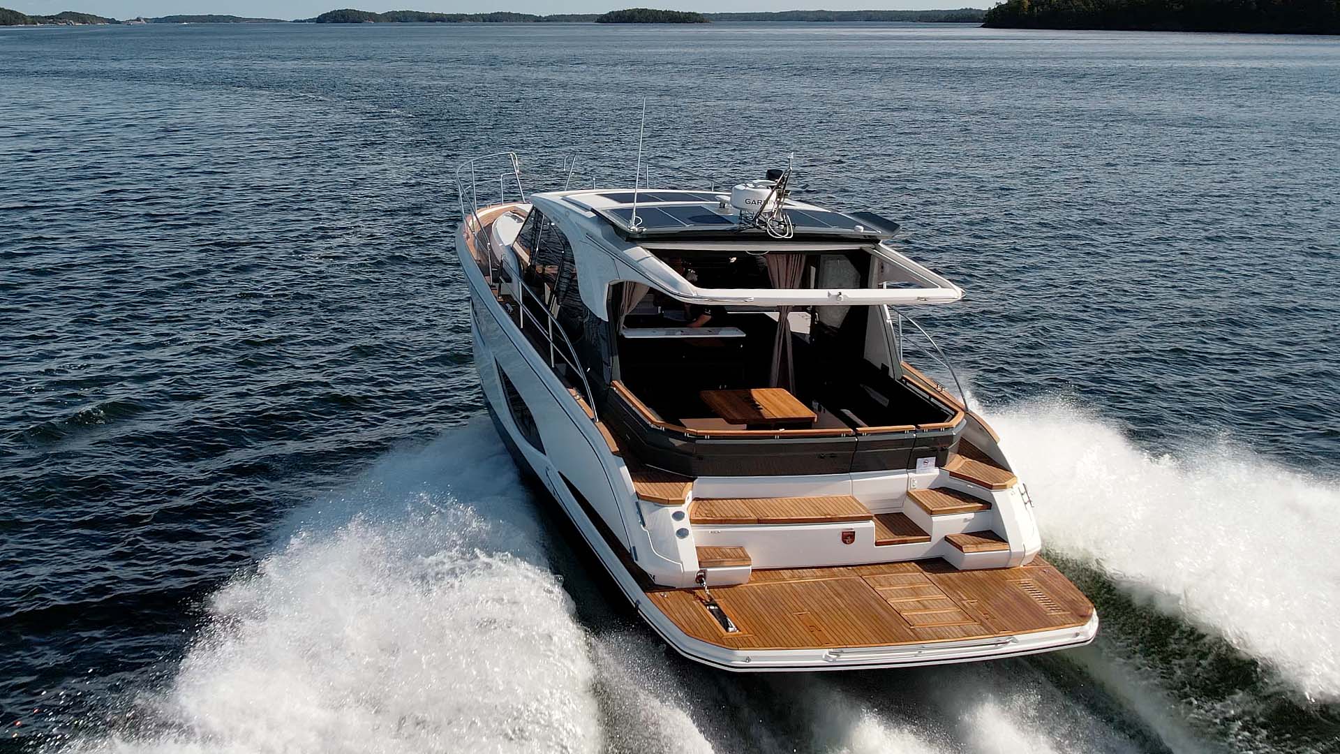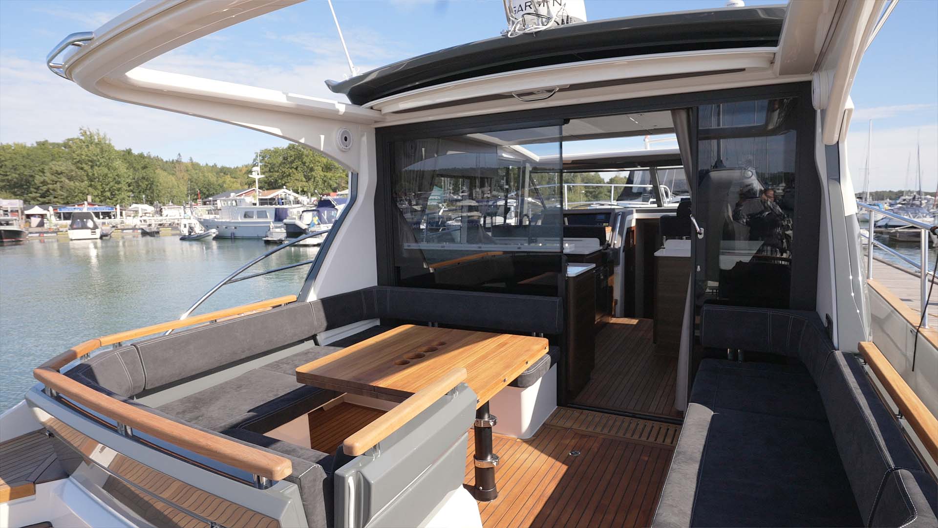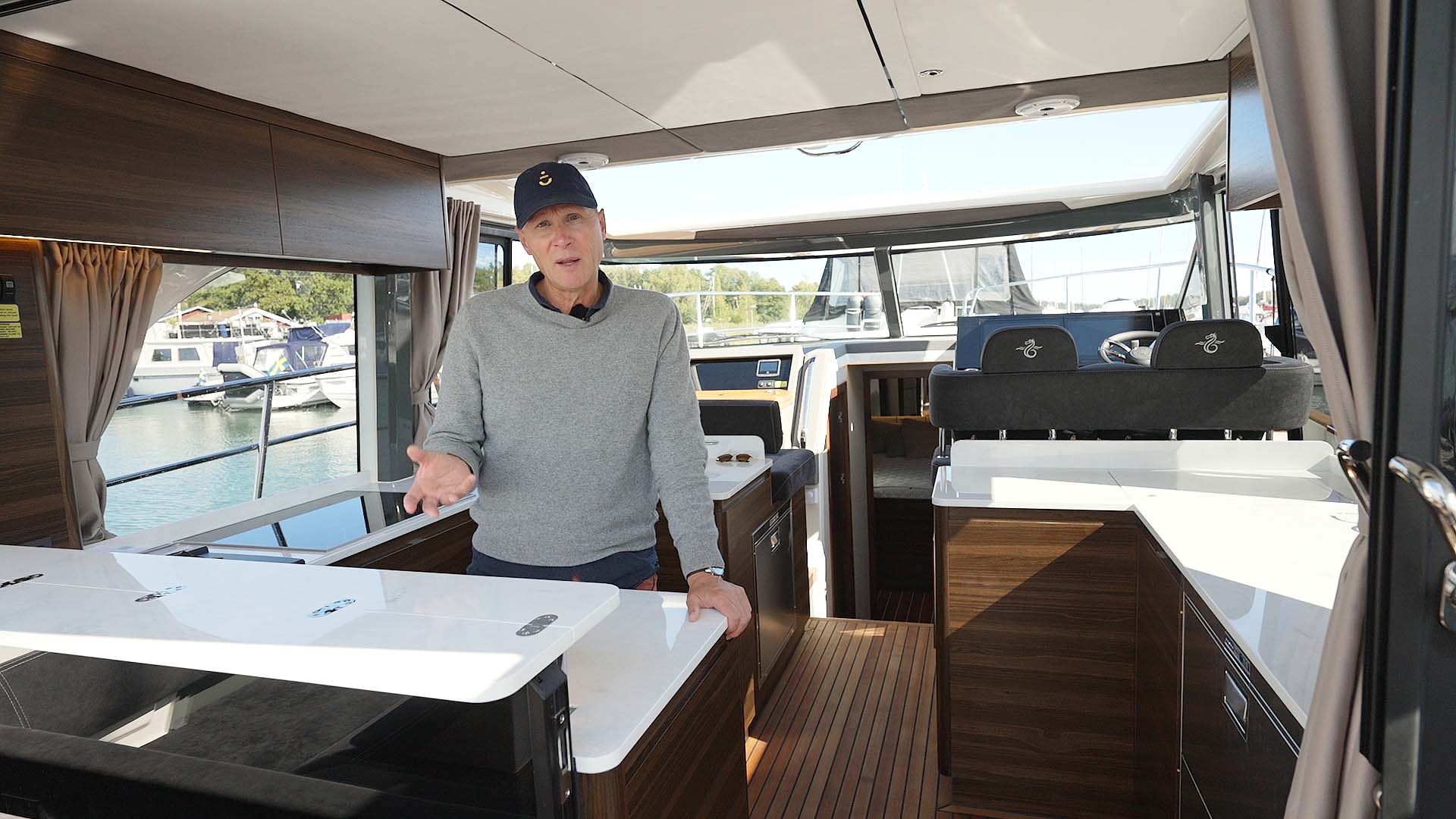 Ta bara pentryt till exempel, som utgör en lika snygg som praktisk avdelning mellan ovan nämnda salong och akterdäck. Ett pentry (läs fullfjädrat kök) väl i klass med vilket kök uppe på torra land som helst. Eller vad sägs om allt som bäddar för en komfortabel tillvaro under långa tider till sjöss där tvättmaskin, en särdeles snitsig sänkbar badbrygga med vagga för vattenskotern, tre högklassiga sovhytter samt en föredömligt luftig inredning bara är några exempel?