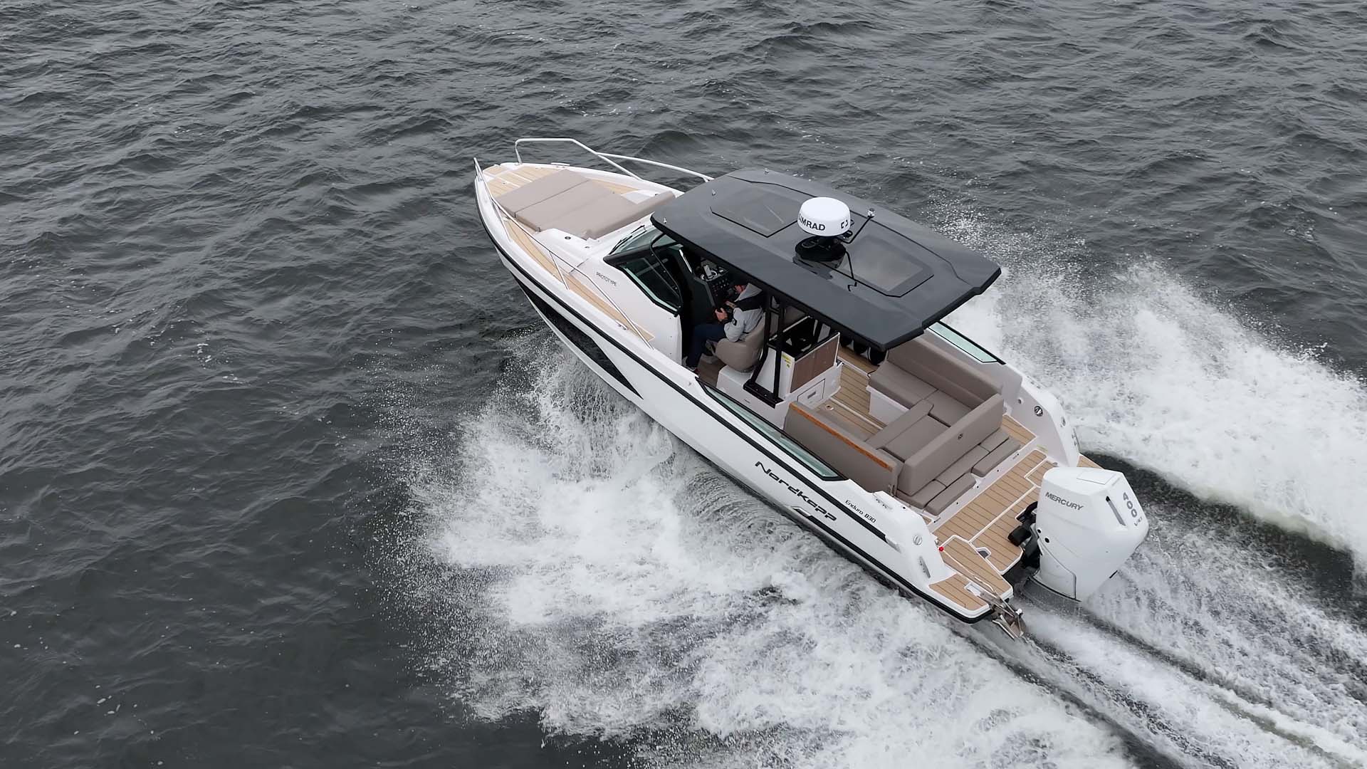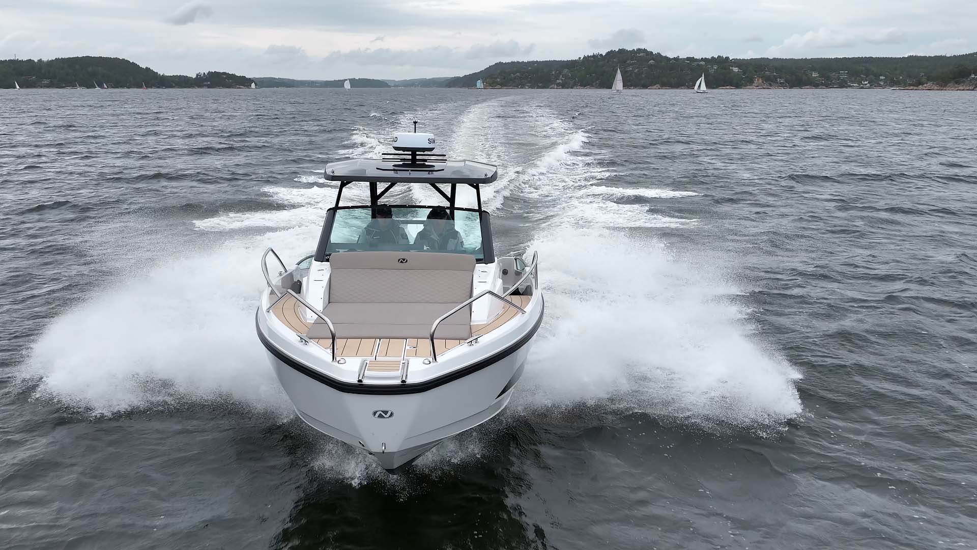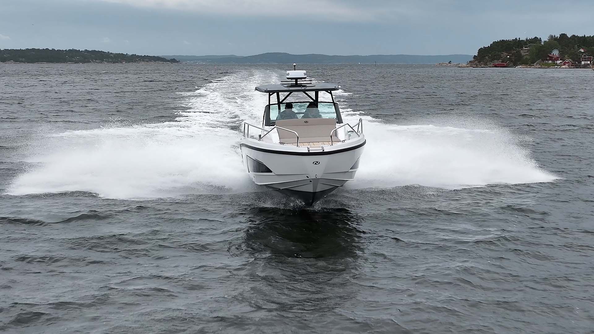 Testbåten är utrustad med en 400 hästars V10 från Mercury – det största singelalternativet. Och det räcker mer än väl. Visst, båten känns lite framtung, men den går ändå rakt och stabilt.