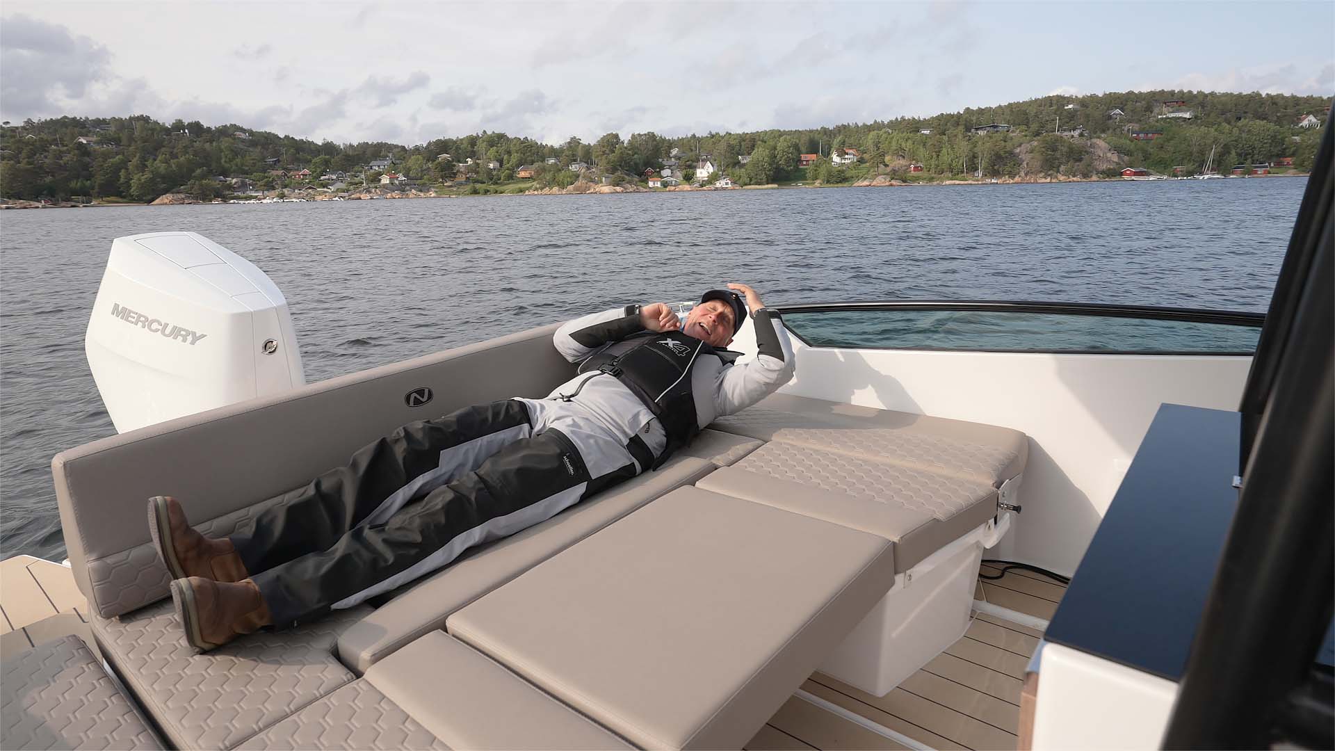 Med värmaren på blir det nästan som en salong ombord. Lägg till den gigantiska solbädden som går att bygga om till sittgrupp, ett pentryalternativ och gott om stuvutrymmen – så får man en båt som funkar lika bra för en dagstur som för en hel helg på sjön.