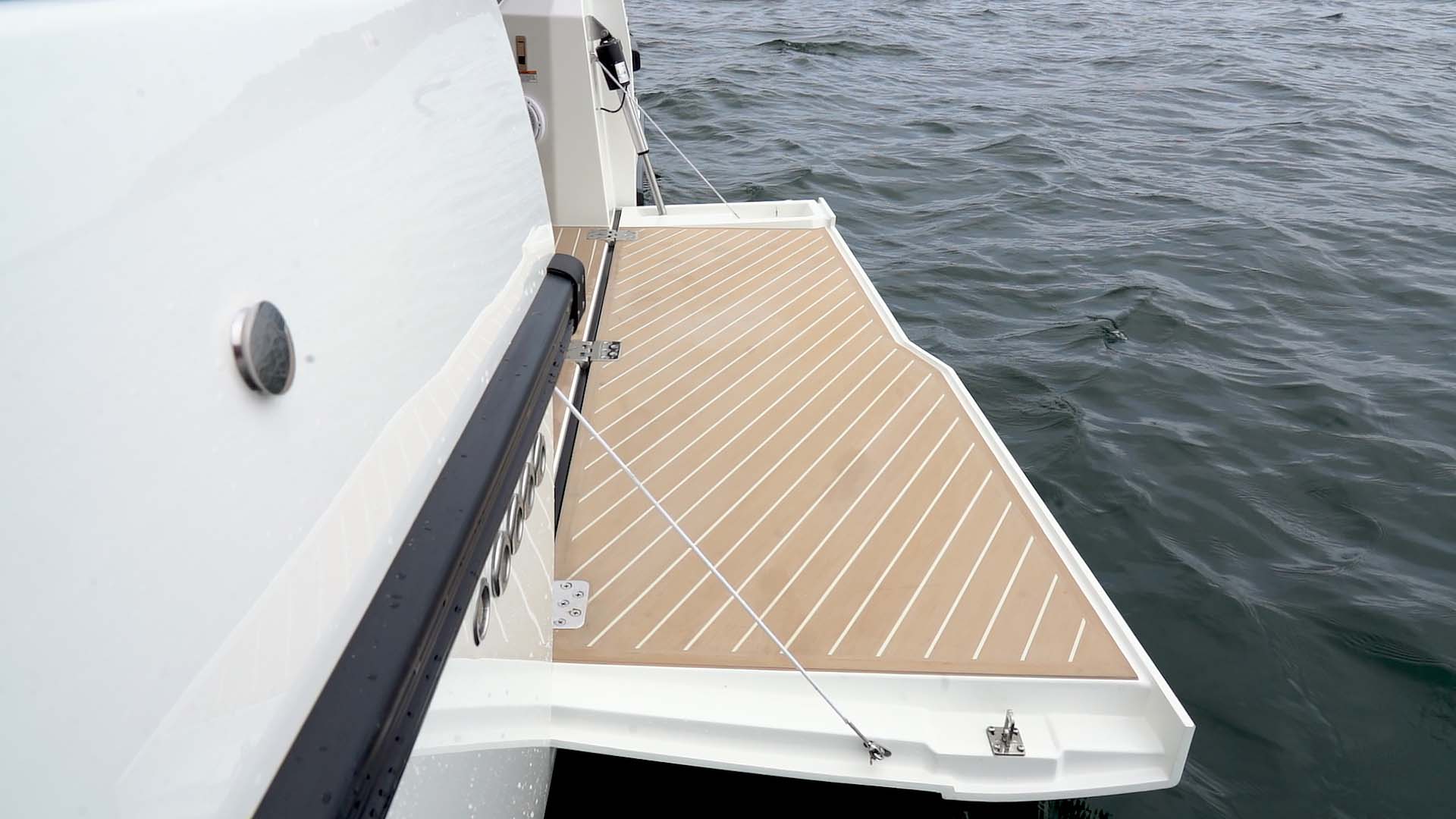 Men åter till frosseriet i finesser. Med ett knapptryck fälls skrovsidorna ut och bildar terrasser på sidorna av båten – en lösning som först sågs på polska Galeon men som Saxdor gjort till ett signum. I nedfällt läge växer däcksytan avsevärt och känslan av flytande badplattform är inte långt borta.