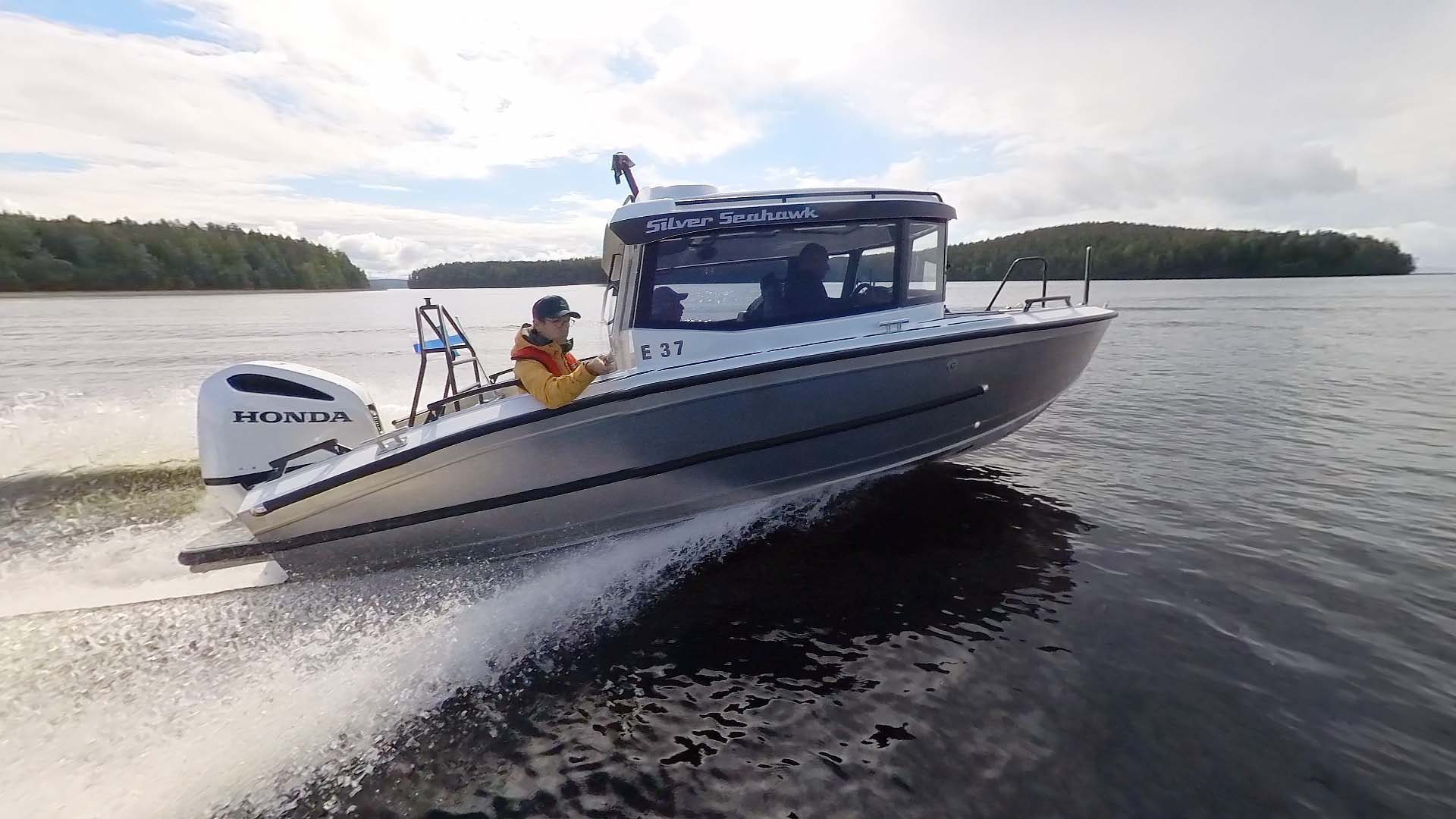 Med en Honda på 200 hk levereras en toppfart på 36 knop och nej – Silver Seahawk Cabin kommer aldrig att kommas ihåg som någon högeffektiv fartbåt. Därtill krävs steglister och massor av annat som man har prioriterat bort i detta fall. Claes reflekterar: