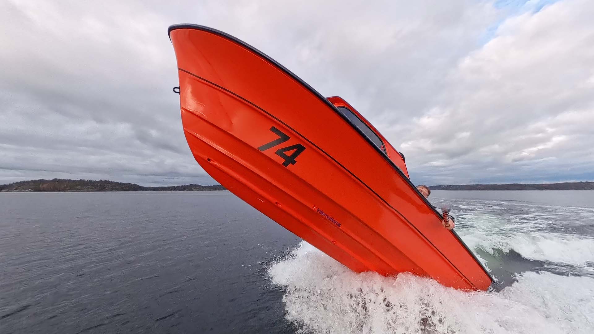 En Mercury 250 R på 250+ hästkrafter räcker till en toppfart på hisnande 74 knop, vilket gör Viktor Walkins Fjordling 17 HT till en av Sveriges absolut snabbaste. Det finns mycket att imponeras över, men den oerhört markanta planingströskeln, där det är stört omöjligt att se något framåt överhuvudtaget vid gaspådrag, är inte så praktiskt. Även om vi på bilderna överdriver detta till absurdum. Det måste ju showas lite också!