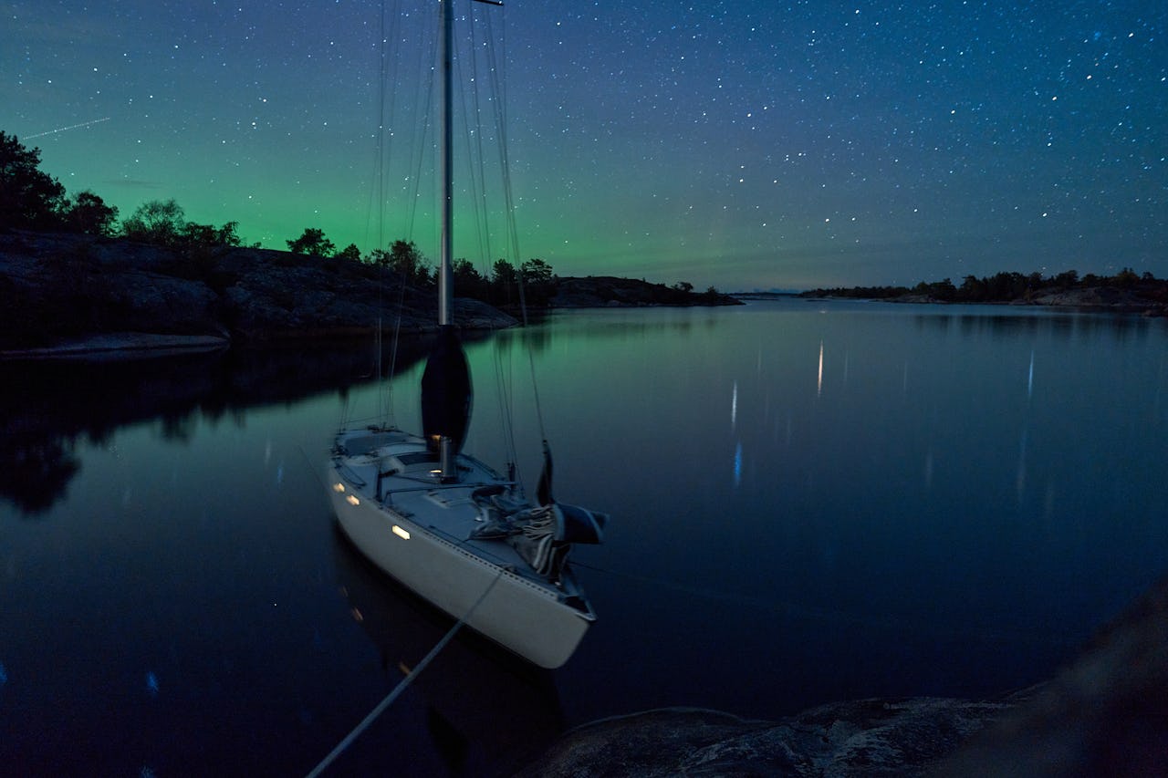 Den andra segelturen, som gick av stapeln förra helgen, var minst lika härlig. Jag och en kompis kom iväg efter jobbet på fredagen och vi fick en otroligt fin segling ut mot Biskopsön i solnedgången. Vi visste att det förmodligen skulle vara mörkt när vi lade till i Koxviken, så vi hade pannlamporna redo. Men eftersom jag har varit där väldigt många gånger förut, fem gånger bara i år, så kan jag i stort sett varenda sten i den viken. Så jag kände mig ganska bekväm med att lägga till där även i mörker. Vi var helt själva när vi gled in i viken och det var fortfarande lite ljus kvar när vi lade till runt kvart i sju på kvällen.