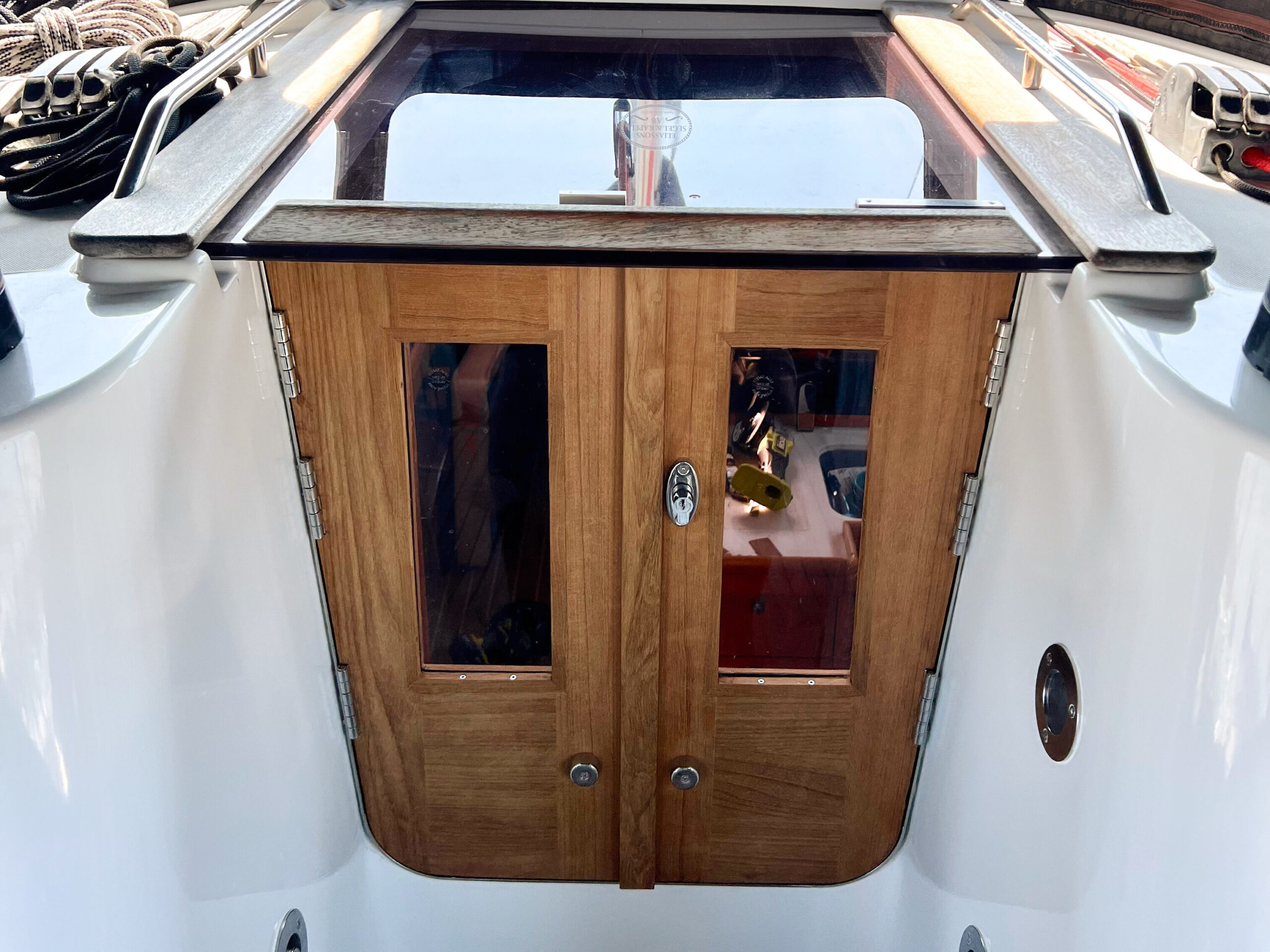 Kanske är det därför projektfingrarna börjar klia just nu. Det är ofta just begränsningarna ombord som gör att idéer uppstår. Små förändringar som förenklar livet i båten och gör att vardagen flyter bättre. Ett par av de lösningarna har vuxit fram över tid. Ett tydligt exempel är den tunga plexiluckan ner i ruffen. Det tog ungefär en vecka innan vi insåg att den inte var byggd för vårt familjeliv ombord. I stället byggde vi nedgångsdörrar i teak, med fönsterglas för ljusinsläpp. Det var vår andra uppsättning teakdörrar, och den här gången visste vi precis vad vi ville ha. En förändring som gjorde stor skillnad i hur båten upplevs ombord.