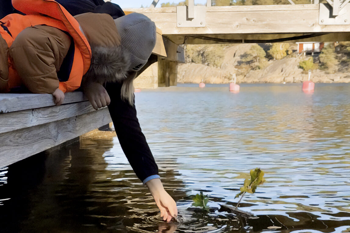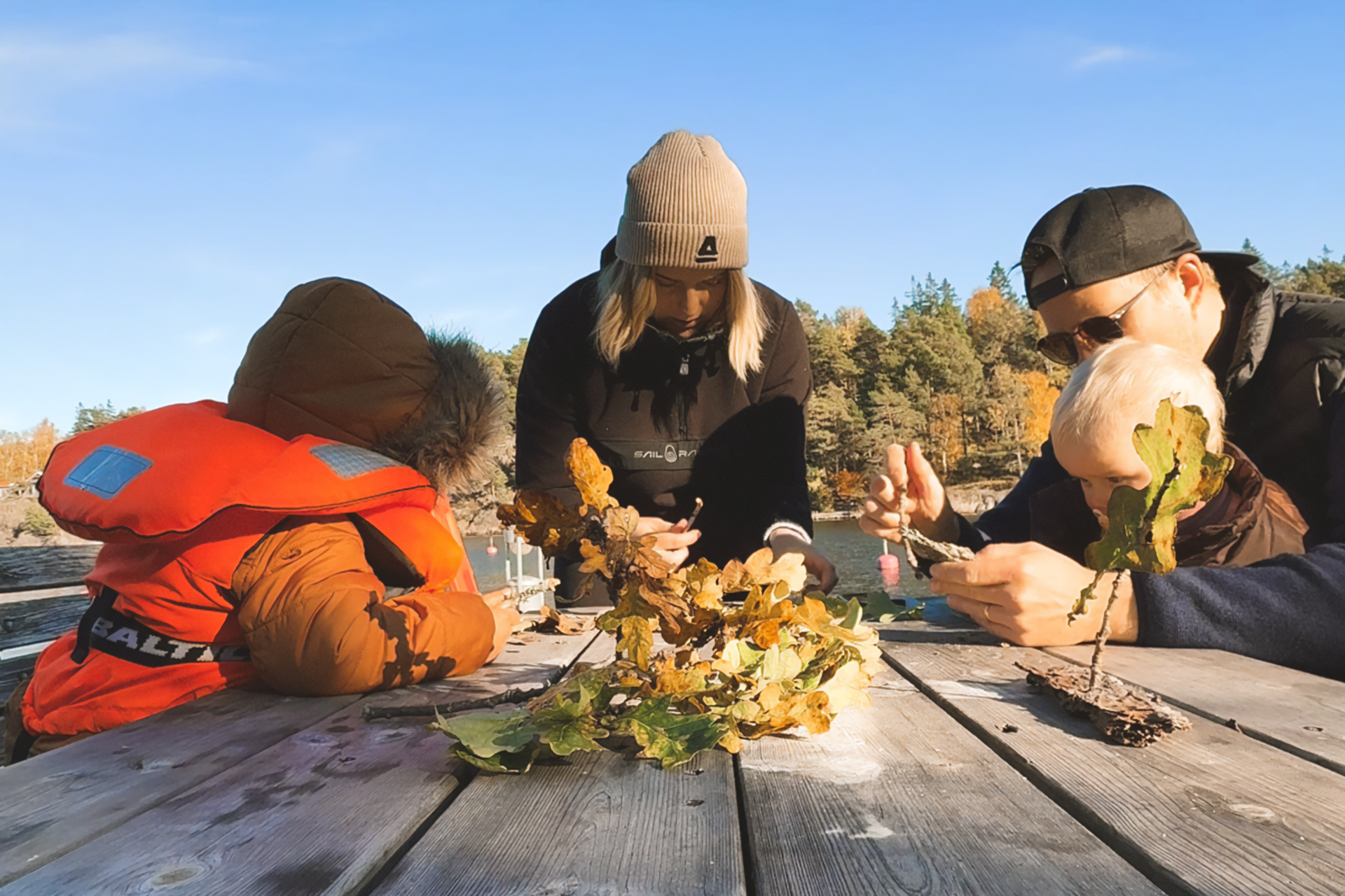 Efteråt går vi en lång promenad i den fuktiga lövskogen, där marken är täckt av gula blad som prasslar under stövlarna. Barnen samlar pinnar, bark och kottar, och snart har vi byggt en hel flotta av barkbåtar som vi släpper ut vid bryggan.