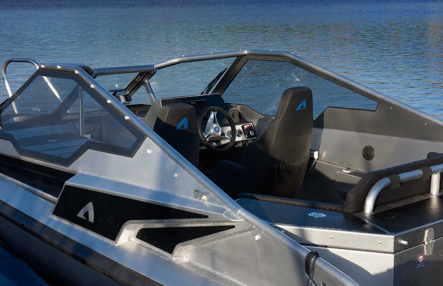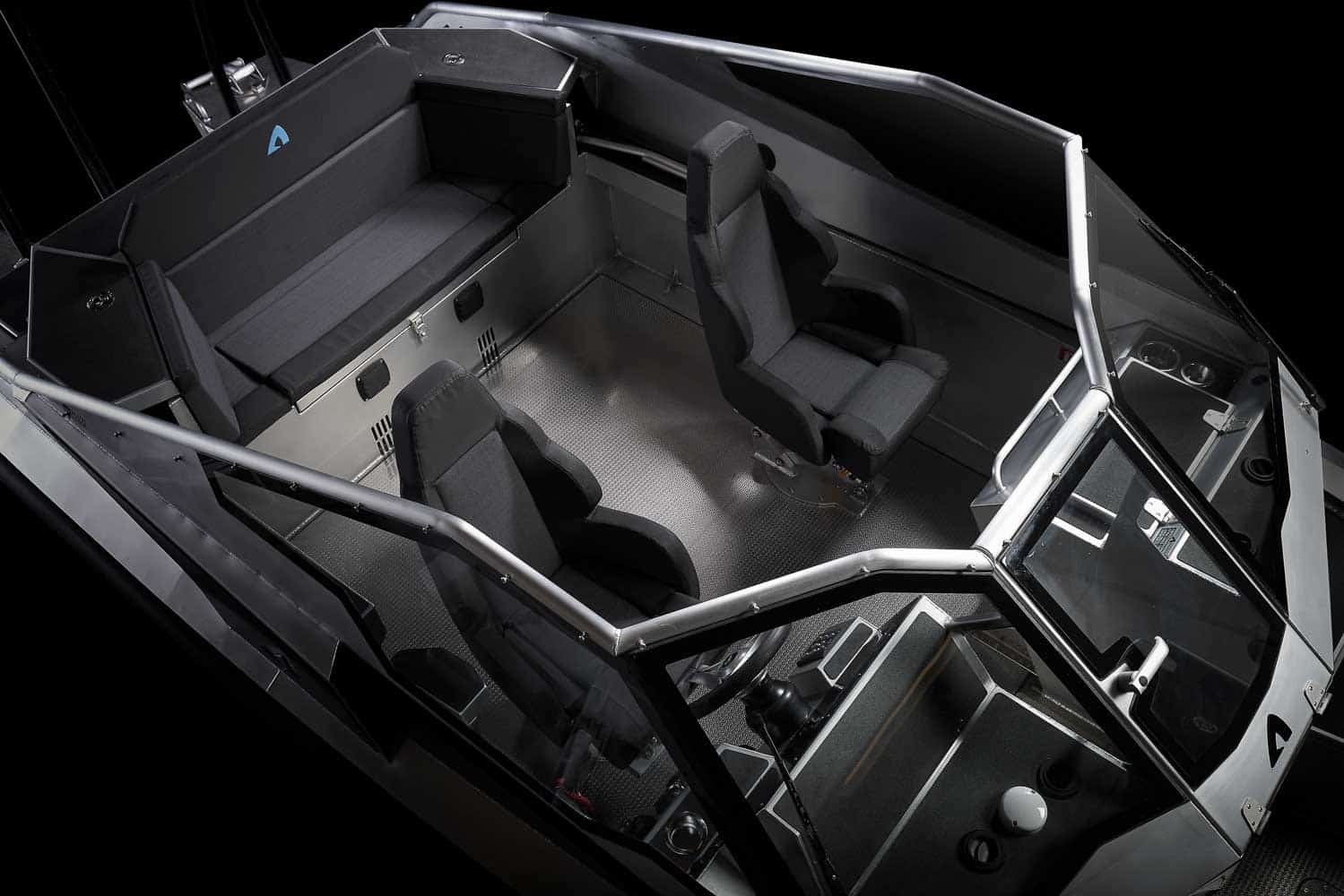 När vi kliver ombord under inomhusvisningen på premärkvällen 29 november så känns sittbrunnen väl skyddad. Rutorna är relativt höga och det lär göra att förare och passagerare kan färdas behagligt. Väldigt kul att se Anytecs nya fjädrande stolstativ och ännu roligare att de är standard.
