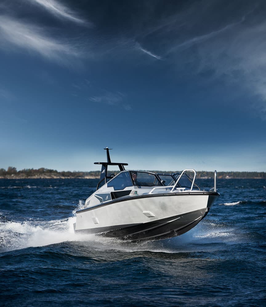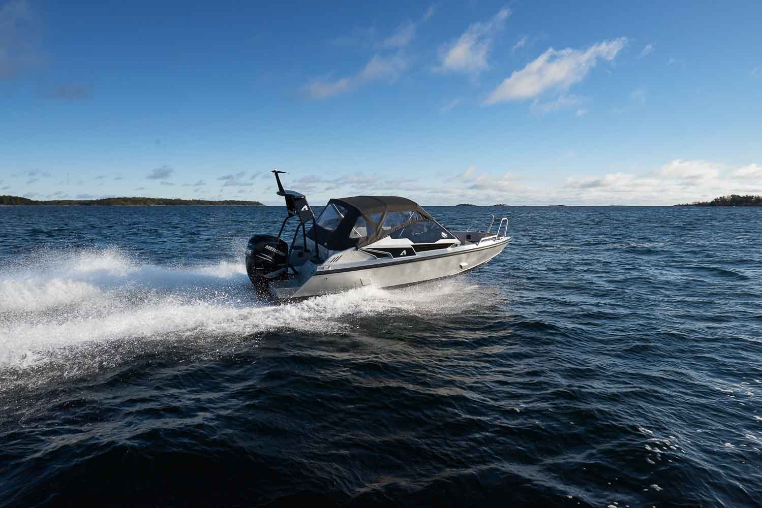 Skrovet är nyutvecklat och en intressant detalj är att badbryggorna är en del av skrovet. Max motor är 225 hk och det räcker till en toppfart på 47 knop.