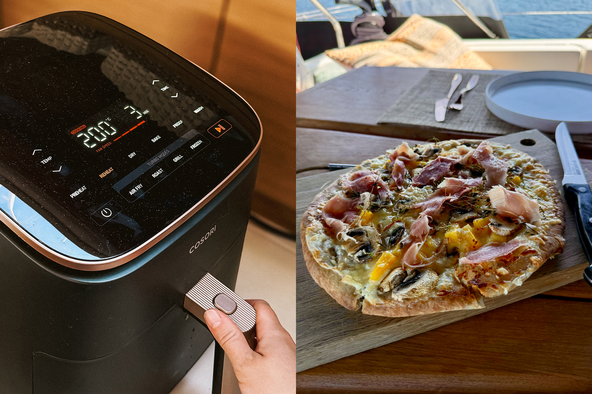 Han syftade inte på pizzan, utan på det faktum att jag sållat marknaden efter en airfryer med låg energiförbrukning och perfekta mått för att kunna stuvas ner i styrbordsoffan. Då visste jag att airfryern inte bara var ett bra köp. Den var årets klara vinnare.