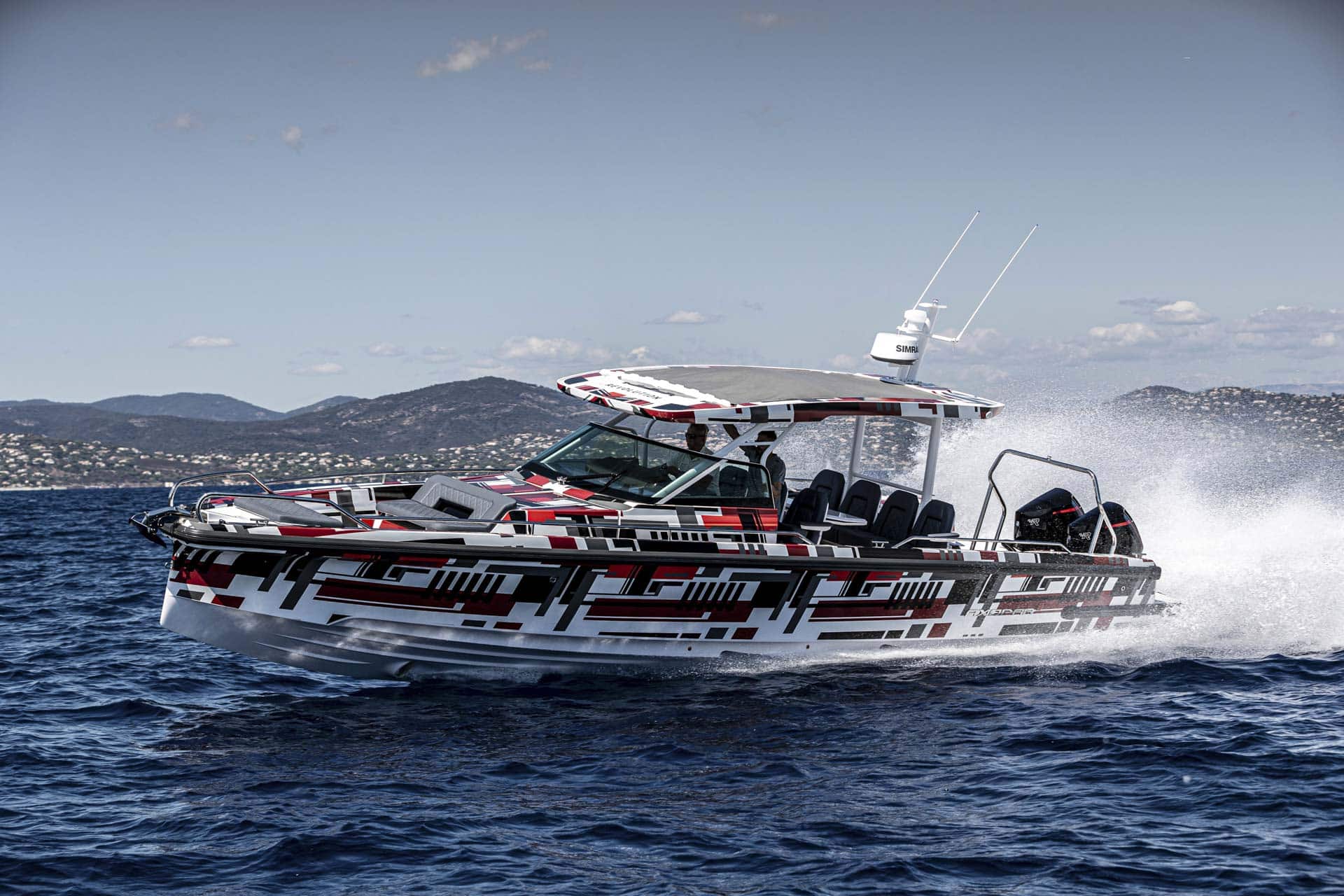 Vill man ha mer fart och beställa en likadan båt som syns på bilderna så får kontakta Brabus Marine som säljer Axopar med 2 x 450 hk (och andra färger och dekaler). Då kan man nå 65 knop.