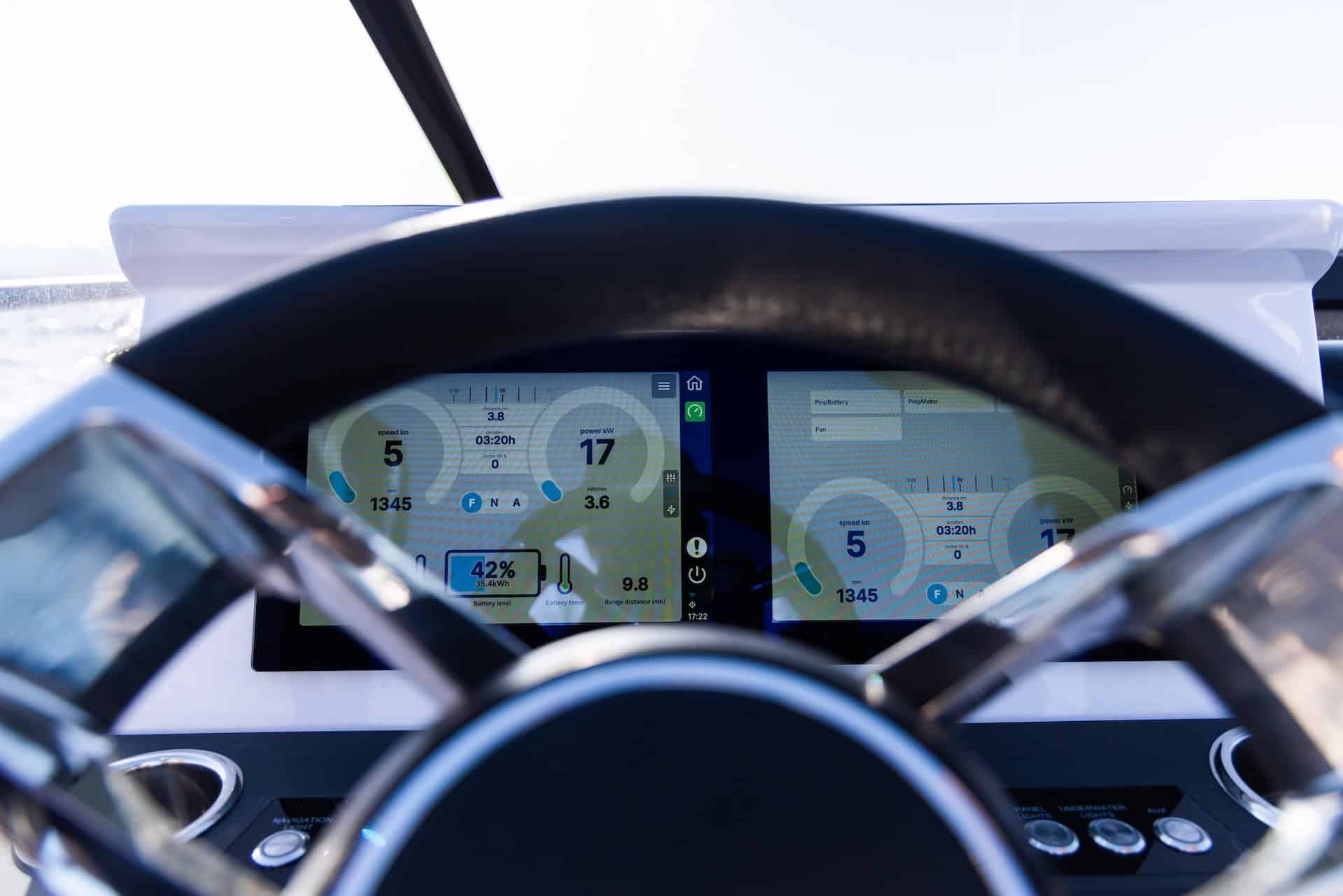 Utombordsmotorn går på 800 volts ström och drivs av 2 x 63 kWh Kreisel-batterier, vilket räcker till en toppfart på 50 knop och en räckvidd på 25 nautiska mil i 25 knop. Därefter lär batterierna kunna laddas på blott en timme – med en snabbladdare med ordentlig fart, ska tilläggas. Att ladda 2 x 63 kWh = 126 kWh på ett 10 amp-uttag (som brukar finnas i en gästhamn) tar 63 timmar.