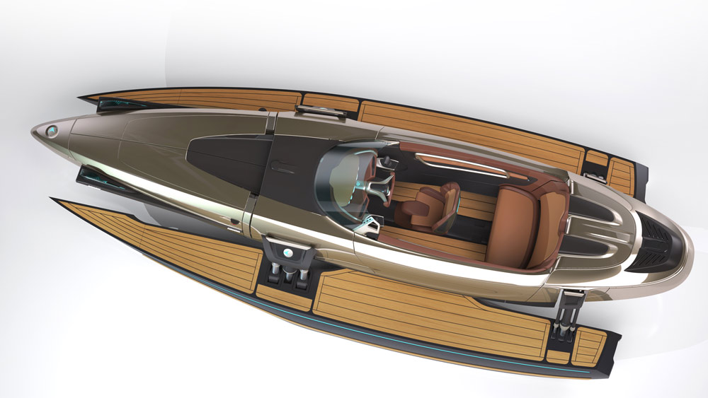 Detta kan vara världens första bärplansbåt som lyckas förena det bästa av alla världar. I fart fälls skroven in och man flyger snålt och stötfritt på bärplan. I hamn förvandlas den till katamaran och blir både rymlig och superstabil.