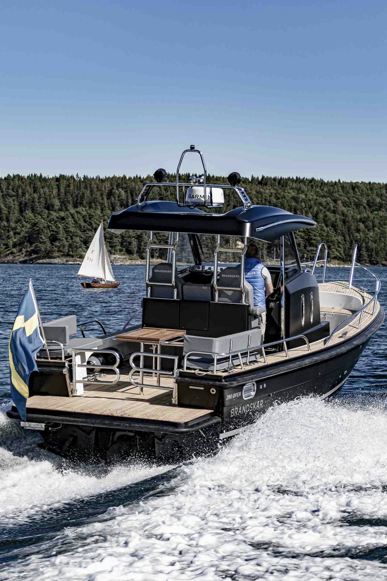 Tvärt om har Brandskär 290 Open särdeles låga fribord och ett överhäng i fören som gör det lekande lätt att kliva iland hemma på den bohusländska graniten.