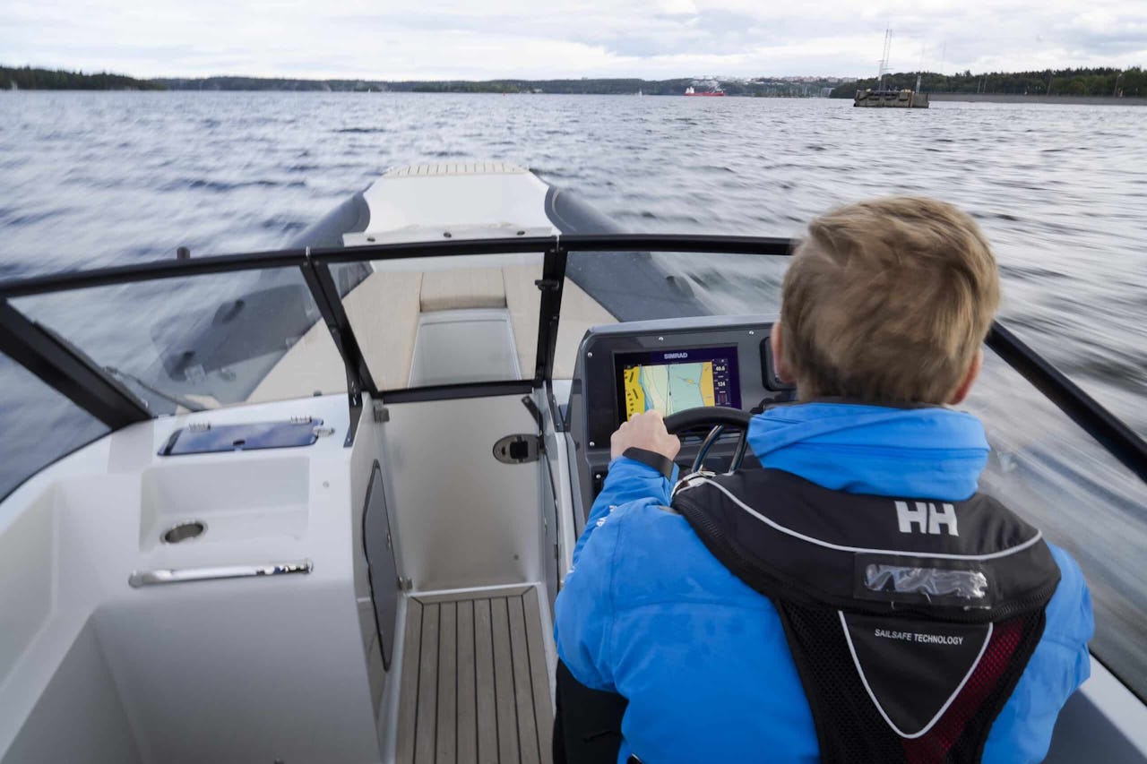 Visst är det trängre ombord än på ordinära bowriders men samtidigt är bärigheten och stabiliteten på en helt annan nivå – utan att man gått miste om livligheten. Det får vi erfara efter en snabb provtur.