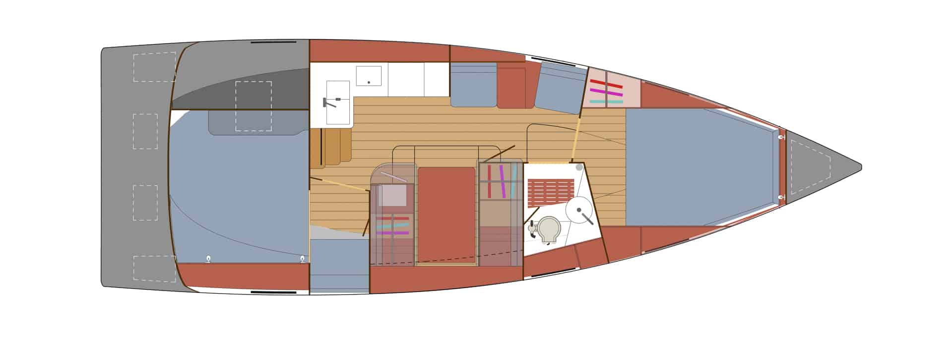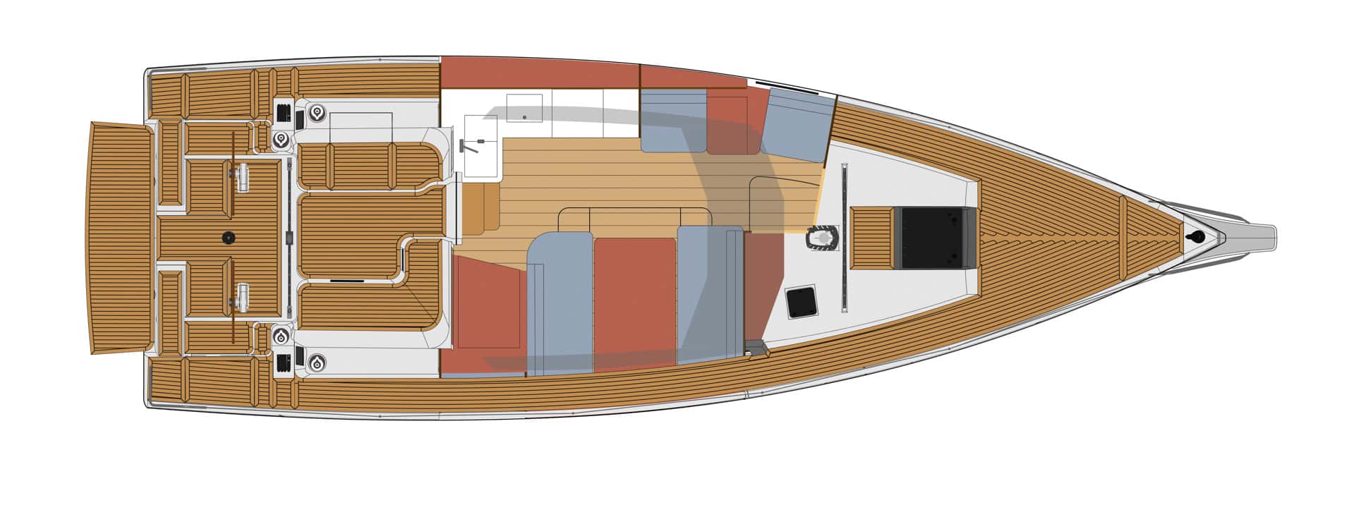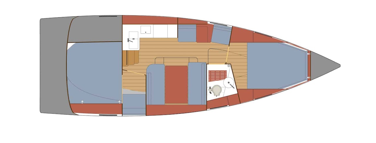 Nybörjaren som kommer från motorbåt och vant sig vid hög komfort och kontakt med naturen genom en ljus salong med stora fönsterytor, skall känna sig hemma. Och steget till miljövänlig framdrift med segel ska kännas smidigt.