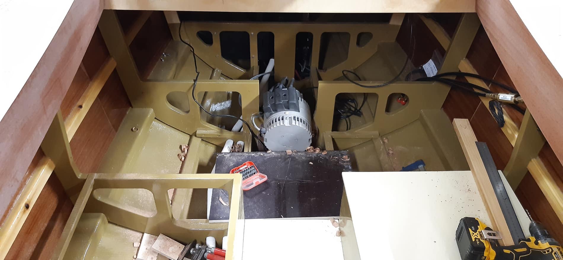 I denna skönhet sitter det en befriande tystgående elmotor som kan knuffa på ekipaget i upp till 40 sjömil eller åtta timmar – om man nöjer sig med att åka i fem knop.
