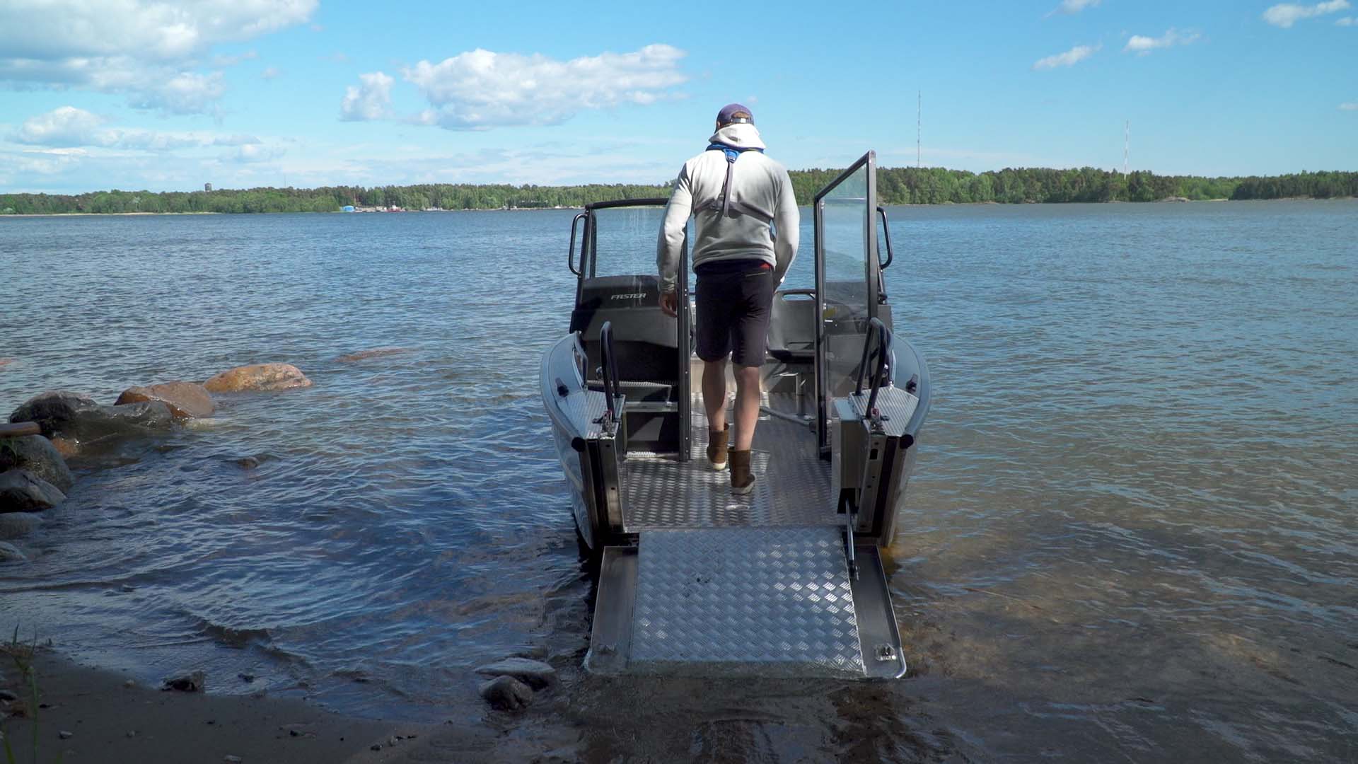 – Man nosar bara upp mot en brygga och fäller ner rampen så att den lägger sig mot bryggan. Sedan fäller man ner den lite mer så att fören reser sig varpå båten ligger hur stabilt som helst utan hjälp av förtöjningstampar.