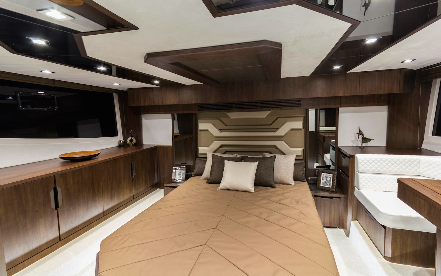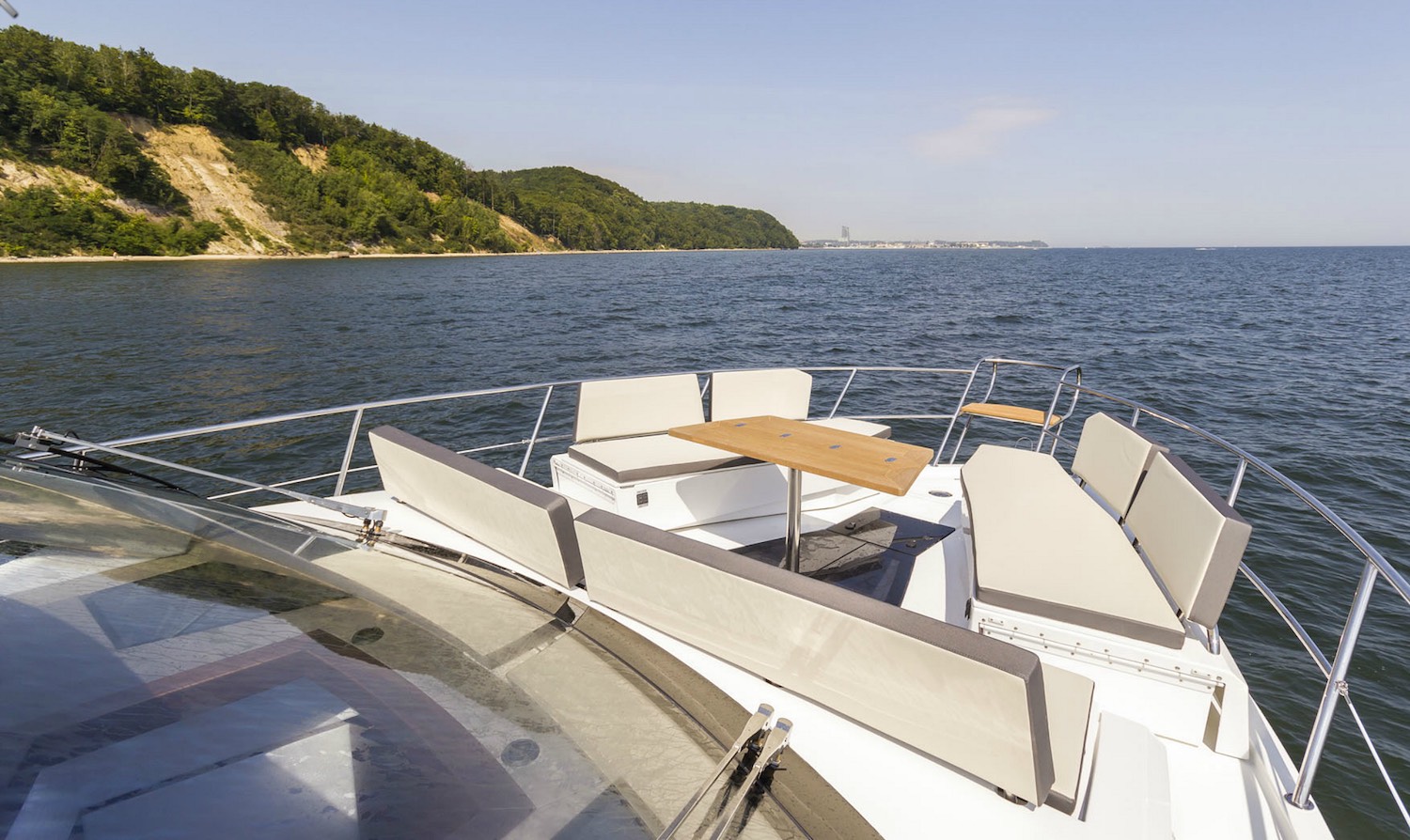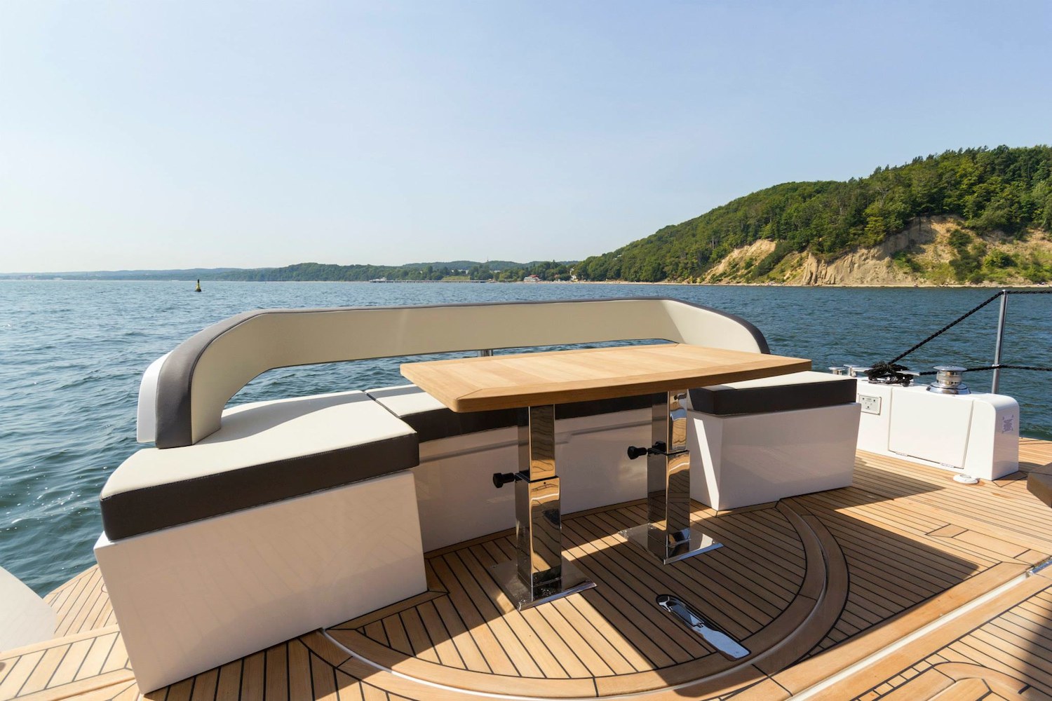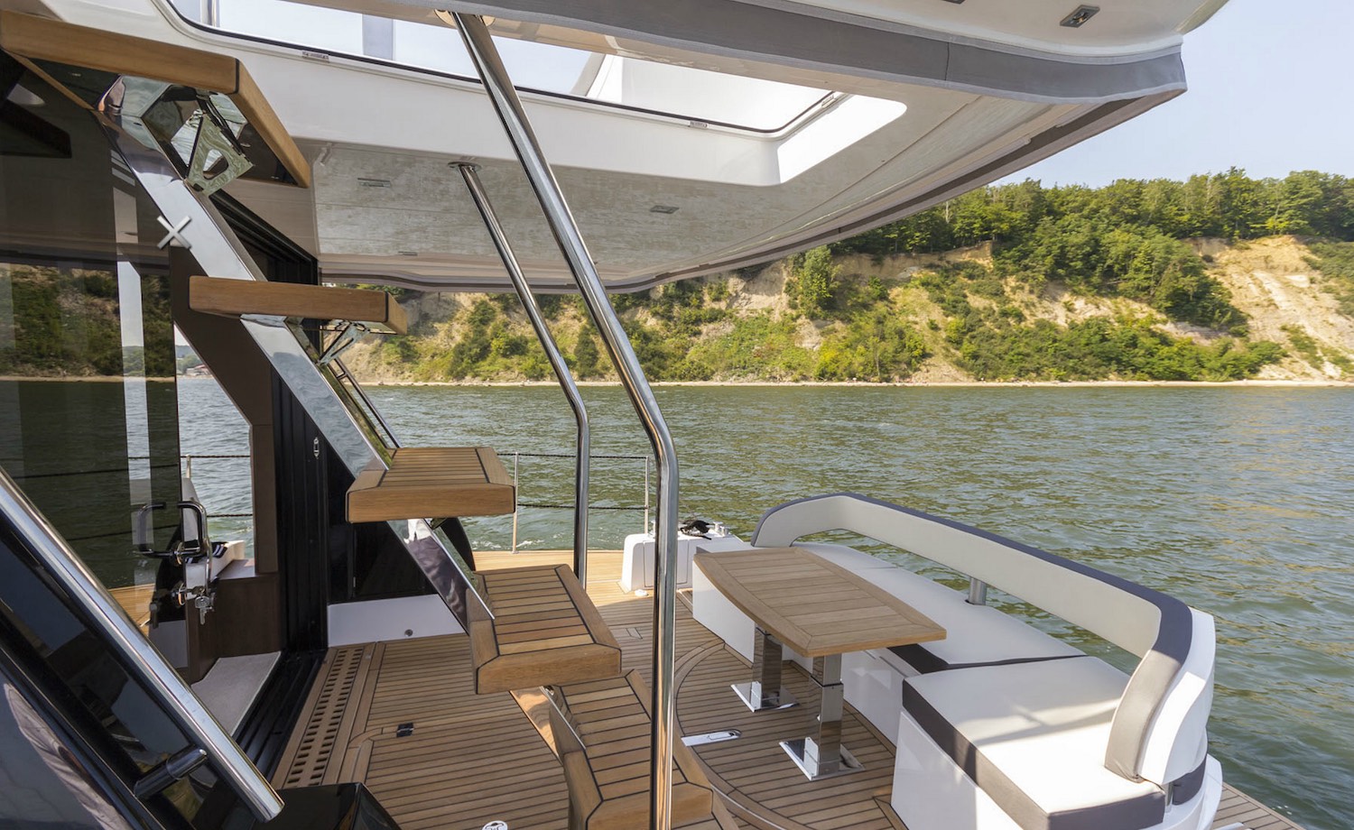 Flybridgen har finesser som uppfällbart matbord, wetbar med grill och kyl samt solsäng och sittplatser för hela kompisgänget.