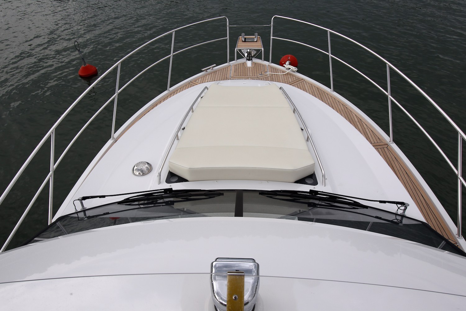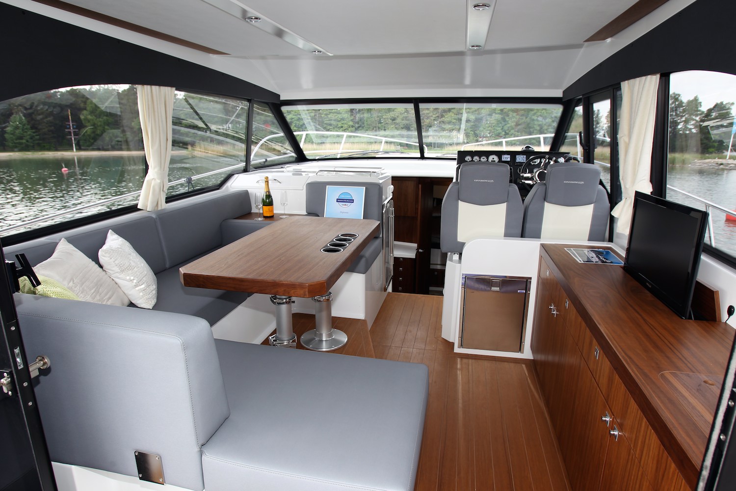 I övrigt är den förvillande lik sin syster med rymlig och ljus salong med mycket ljusinsläpp. Pluspoäng för att man faktiskt kan sitta runt bordet i salongen med utsikt runt om. Något som inte är självklart på flybridgebåtar av den här kalibern.