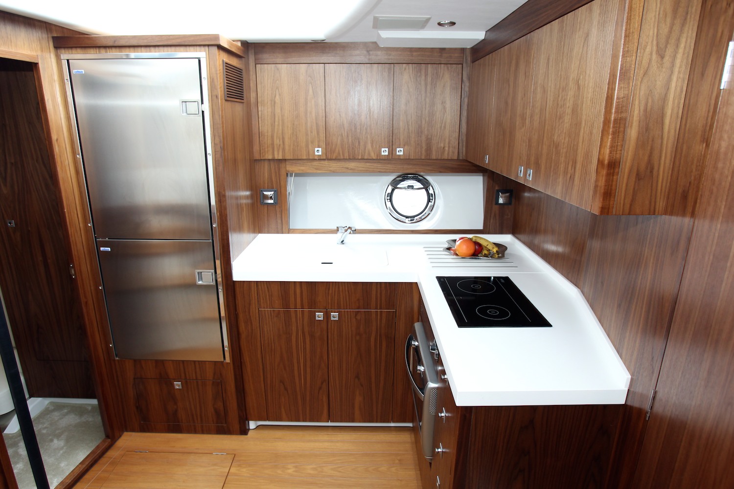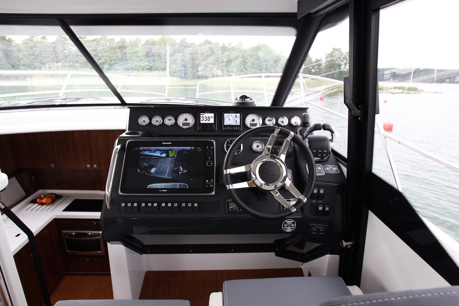 Uppe på flybridgen finns, förutom det redan nämnda, också en så kallad wetbar med vask och rinnande vatten. I nio fall av tio kommer kunden också att kryssa för grill och kylskåp i listan över extratillbehör för att denna enhet ska kännas komplett. Sedan präglas inredningen av en mycket sober stil med en strikt, rak och krusidullfri layout.