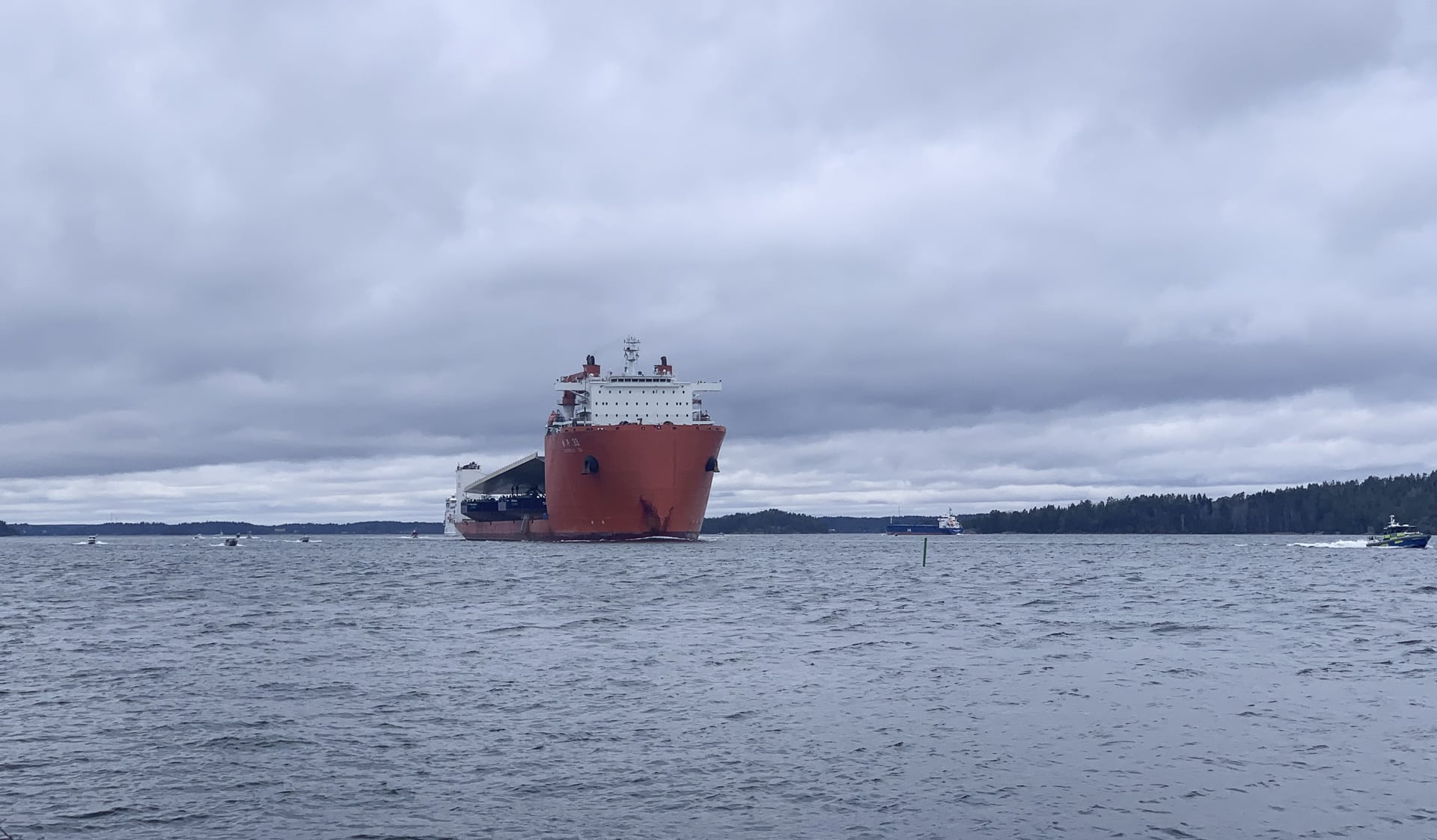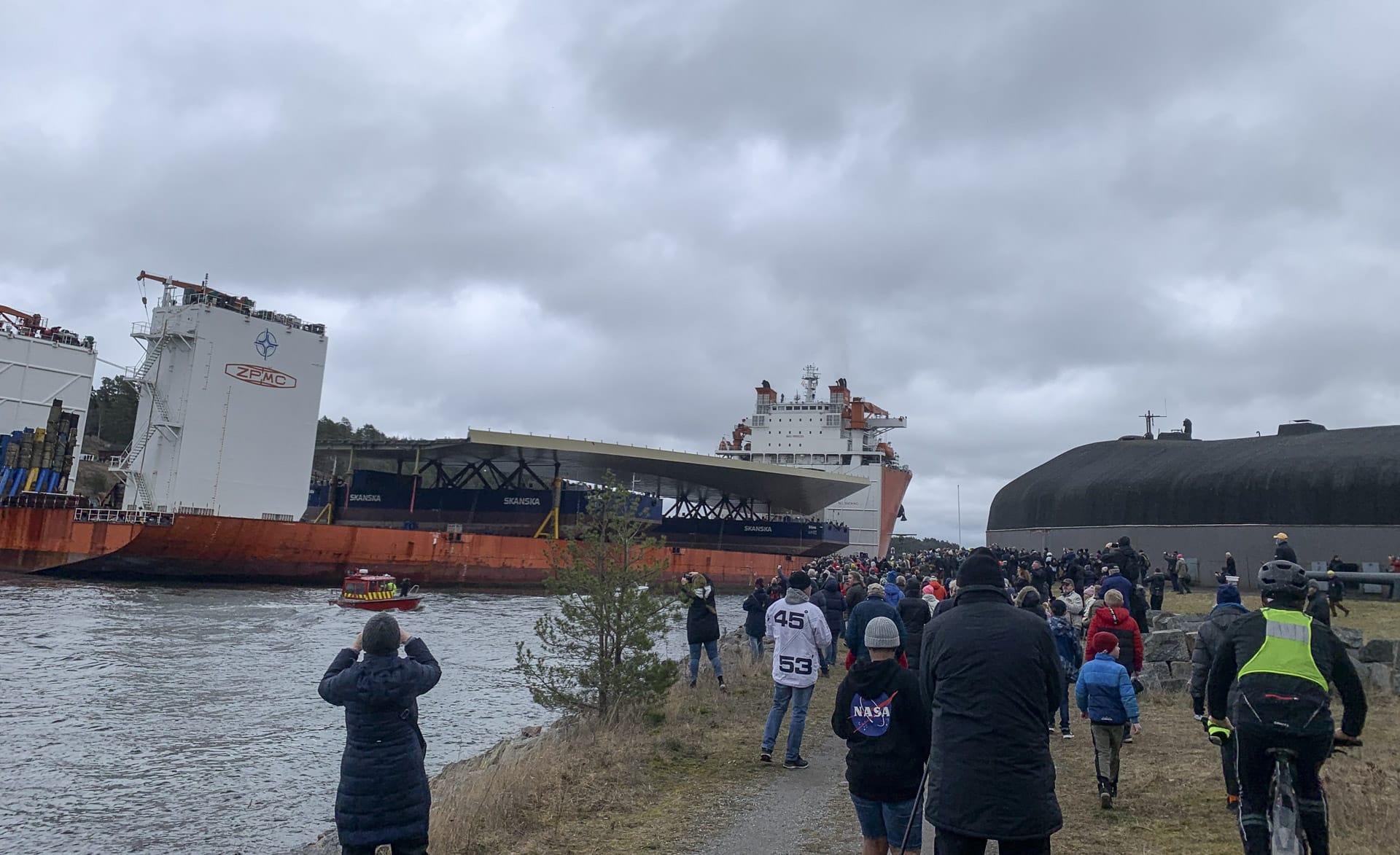 Hamnens reporter är en av tusentals människor som är på plats när fartyget med den bredaste last som någonsin angjort centrala Stockholm passerar det smala sundet mellan Rindö och Värmdö.
