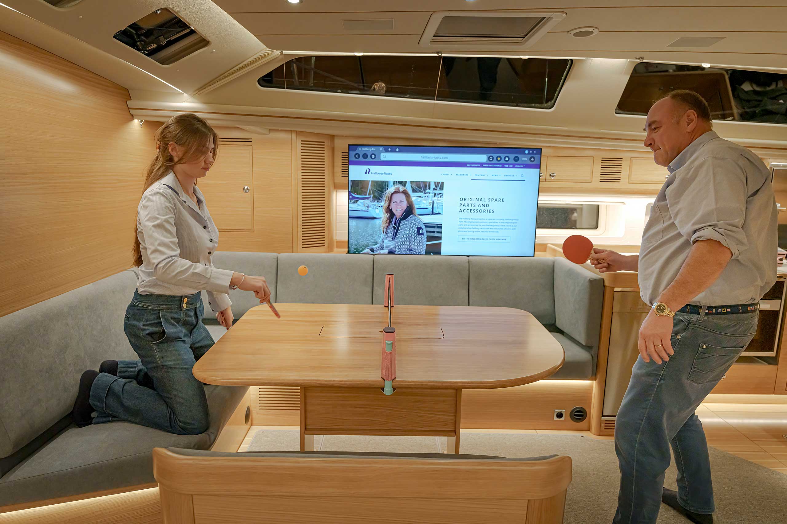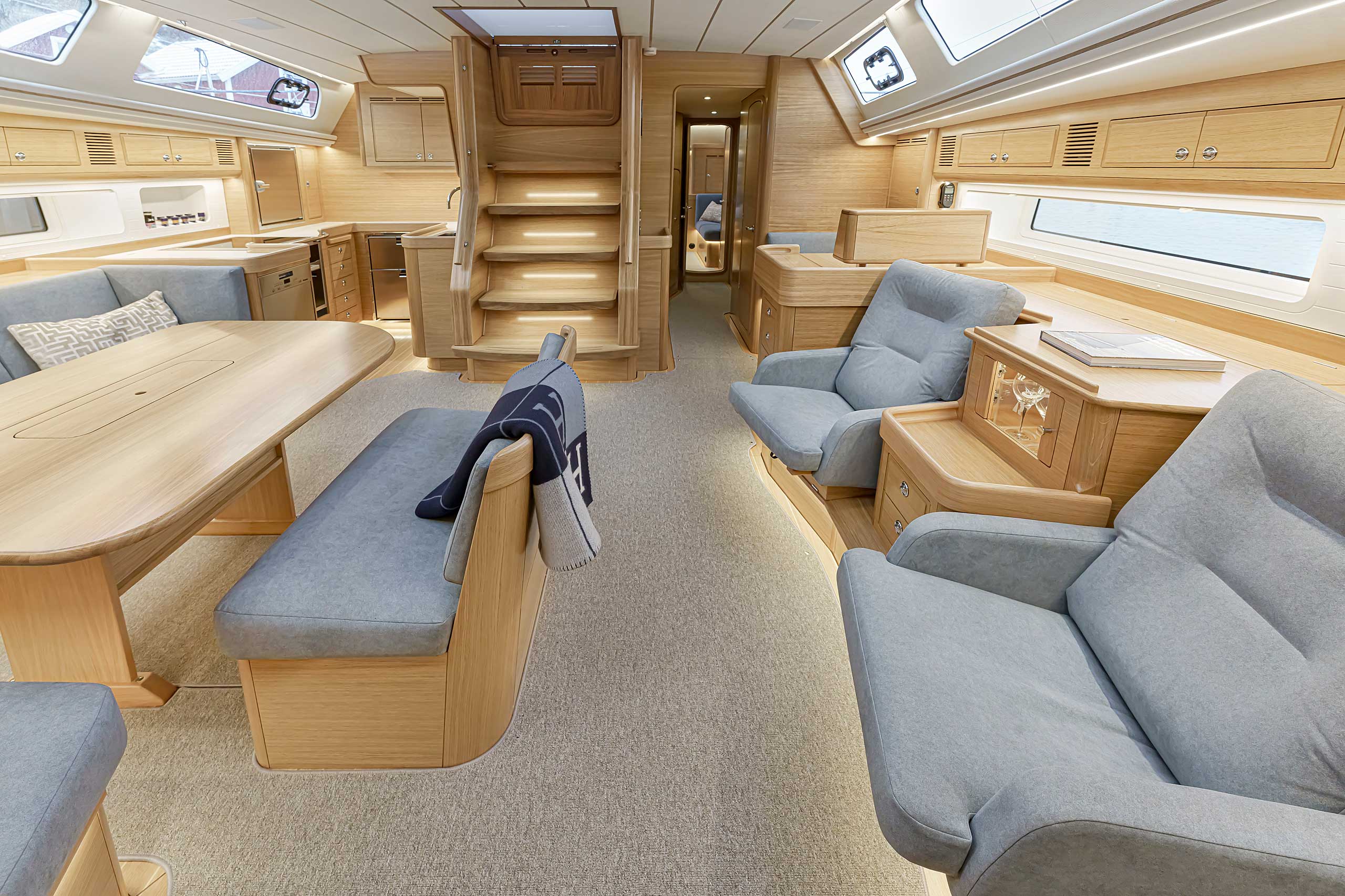 Det har lagts stor vikt vid att ha ett naturligt ljusinsläpp via de stora skrovfönstren i salongen. Man har också, i sedvanlig ”Hallberg-Rassy”-anda sett till att inga utrymmen går till spillo.