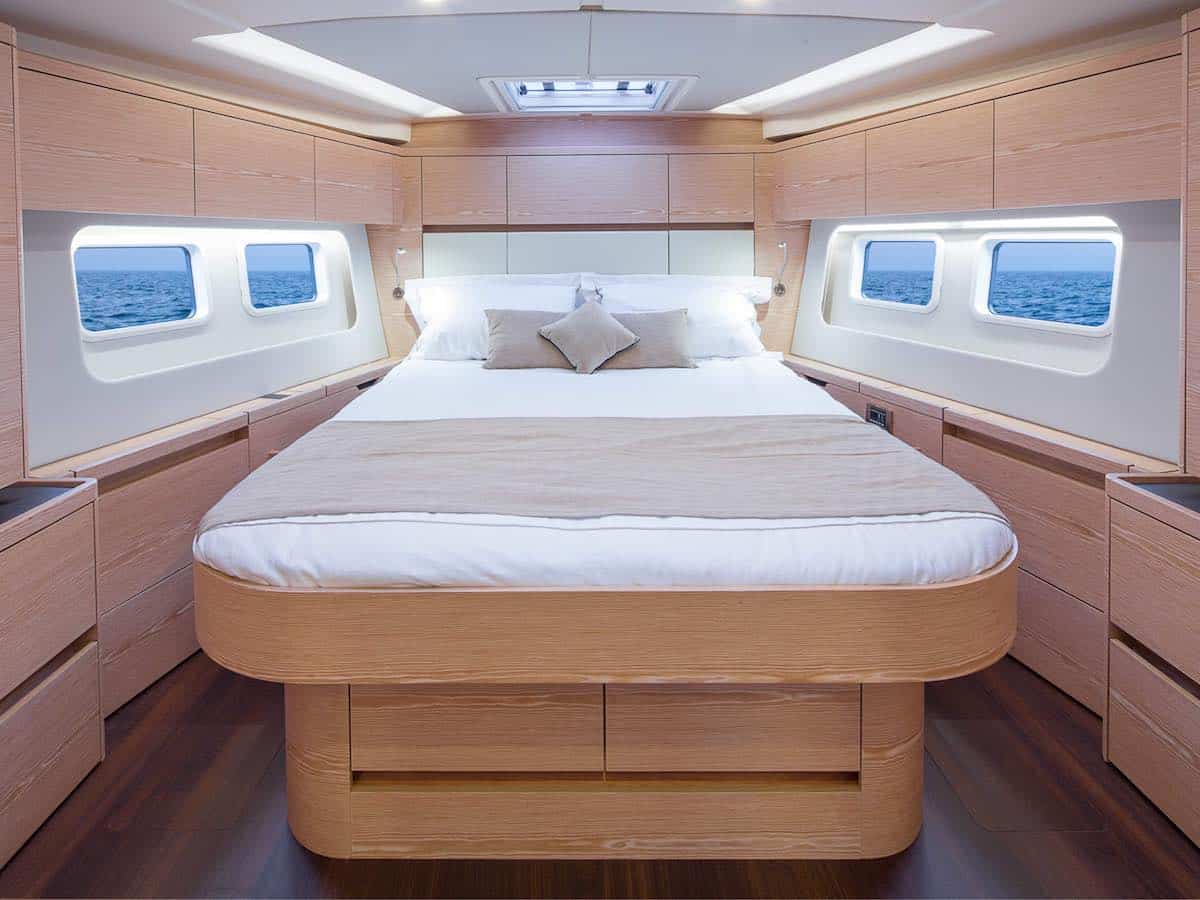 Den rymliga 3,6m långa ägarkabinen sträcker sig hela skrovets bredd för om masten. Det finns omfattande ljudisolering inbyggt i huvudskottet, medan en gummipackning automatiskt förseglar luckan under dörren.