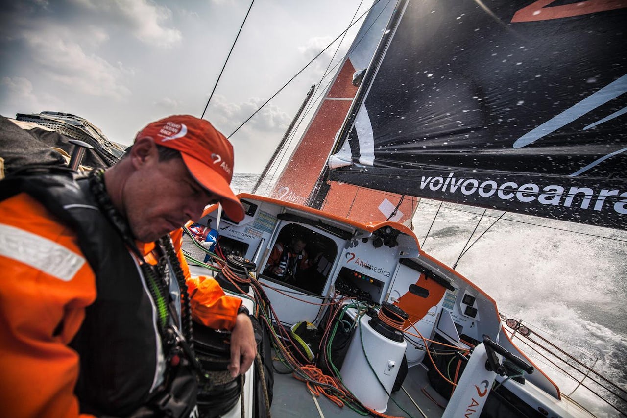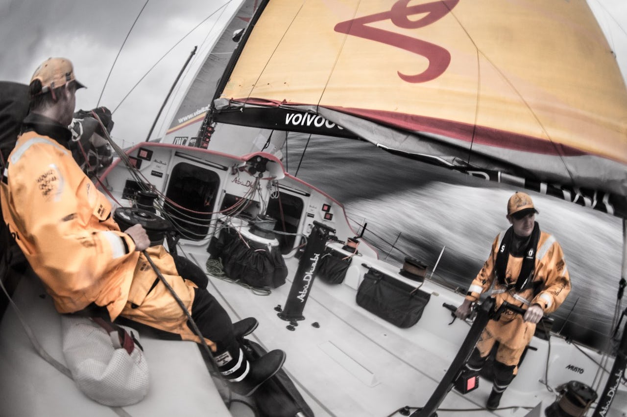 ”We’re off and on our way to sunny Auckland. The good news is we have wind (always useful when trying to get somewhere fast on a sailing boat), the bad news is there are waves, and lots of them. The sea temperature is relatively warm, (when it hits you in the face, repetitively), and we’re all in one piece, just! The bad news is there are waves, lots of them, short and sharp ones. So as we sail along upwind at 11-12 knots it’s a bit like driving my old Fiat panda (with no suspension) on an un-made road with lots of pot holes. Only as we’re sailing on an upwind course the boat is very heeled over, meaning not only are we slamming up and down in the chop but we’re also living at 25-30 degrees of heel (I never tried this in my Fiat Panda but I’m sure it’d be about as comfortable as it is in a Volvo Ocean 65).