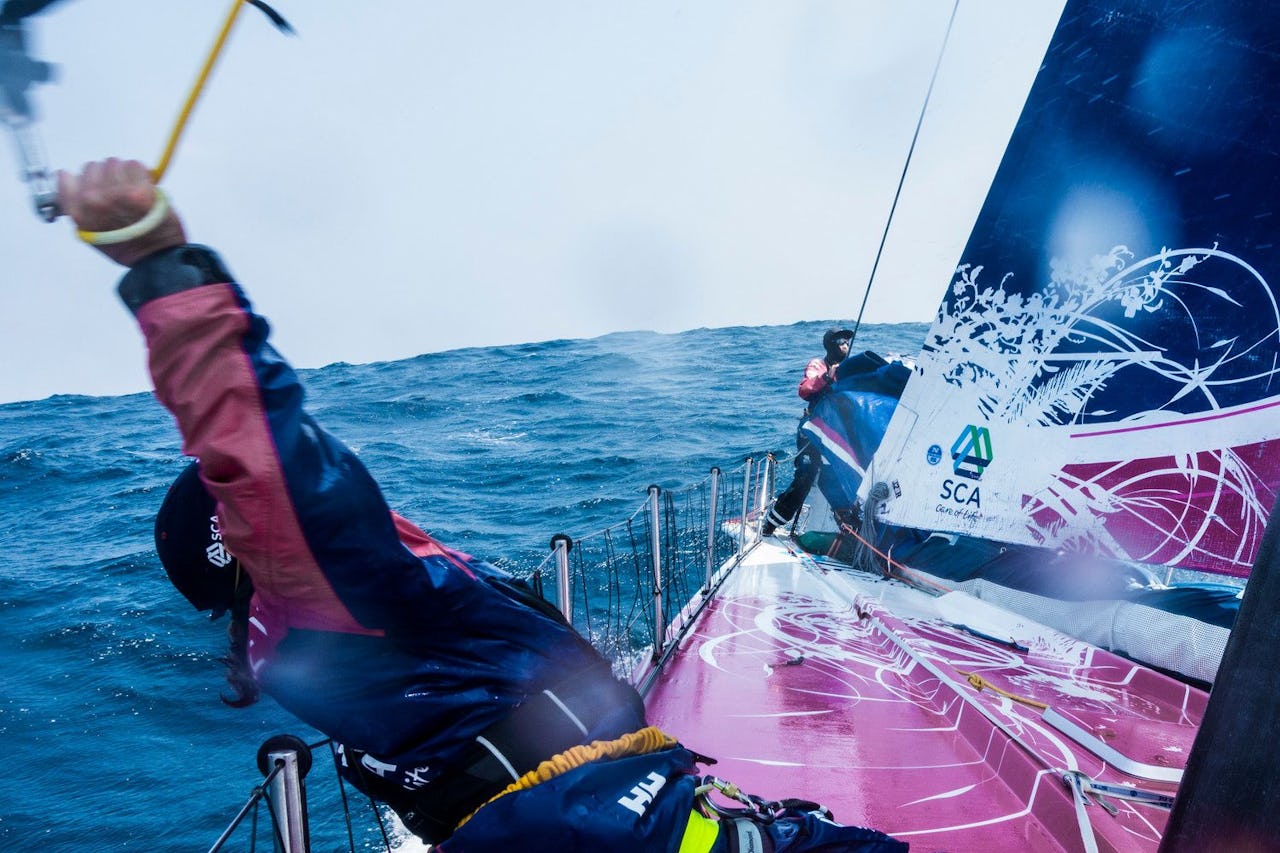 – Trots den tuffa tillvaron tävlar vi 100 procent hela tiden ombord på Team SCA, säger svenskbåtens skeppare Sam Davies.
