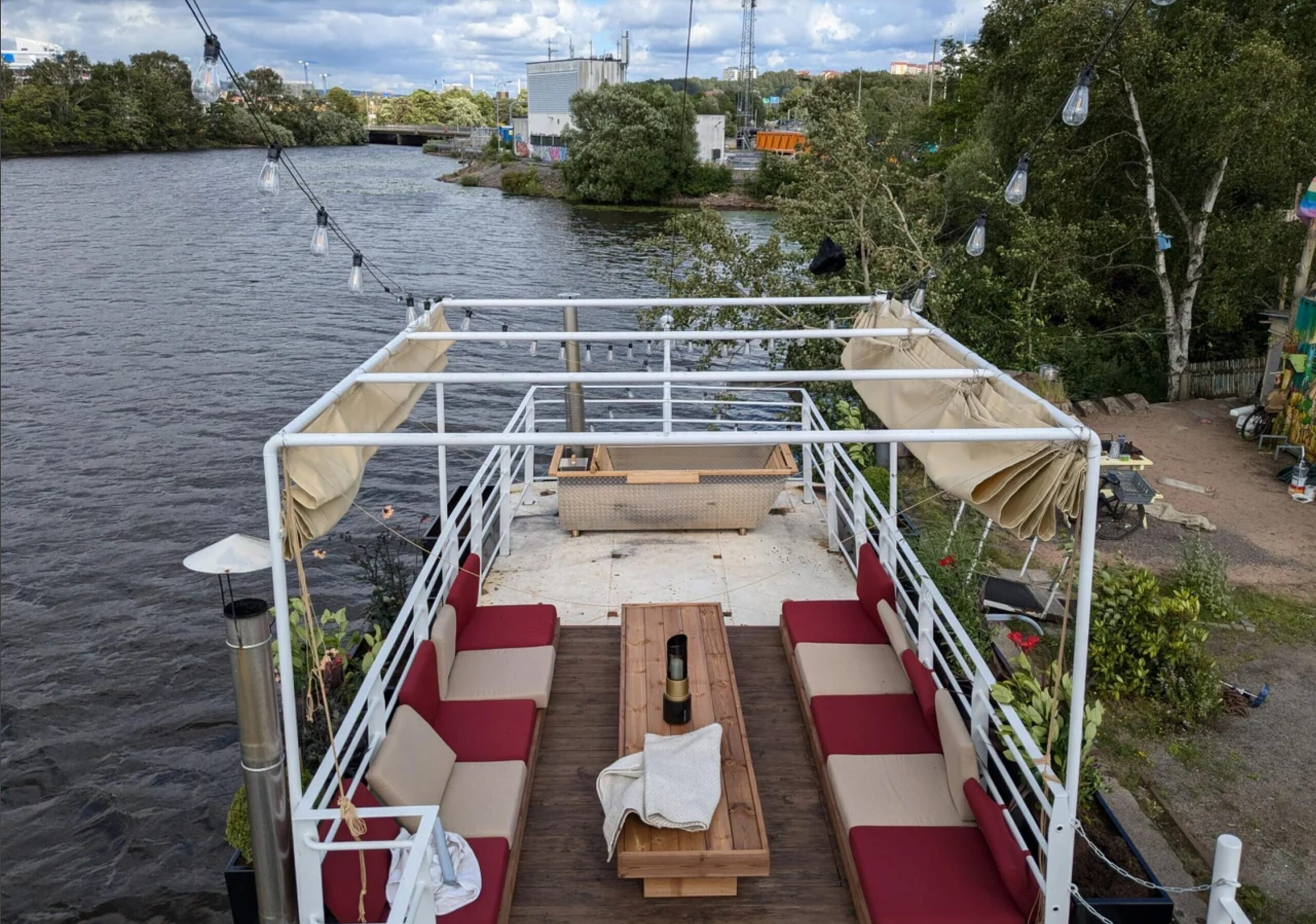Den gamla bogserbåten fick nya sällskapsytor, ett DJ-bås i styrhytten och fördelat på de 70 kvadratmetrarna ryms allt man kan tänkas behöva för ett bekvämt bohag: kök, badrum, sovrum, tvättstuga och en walk-in-closet.